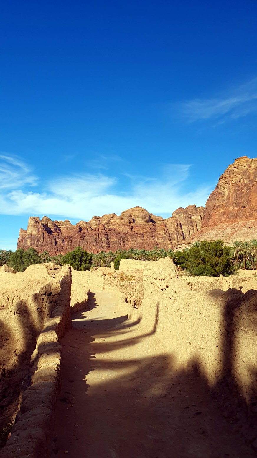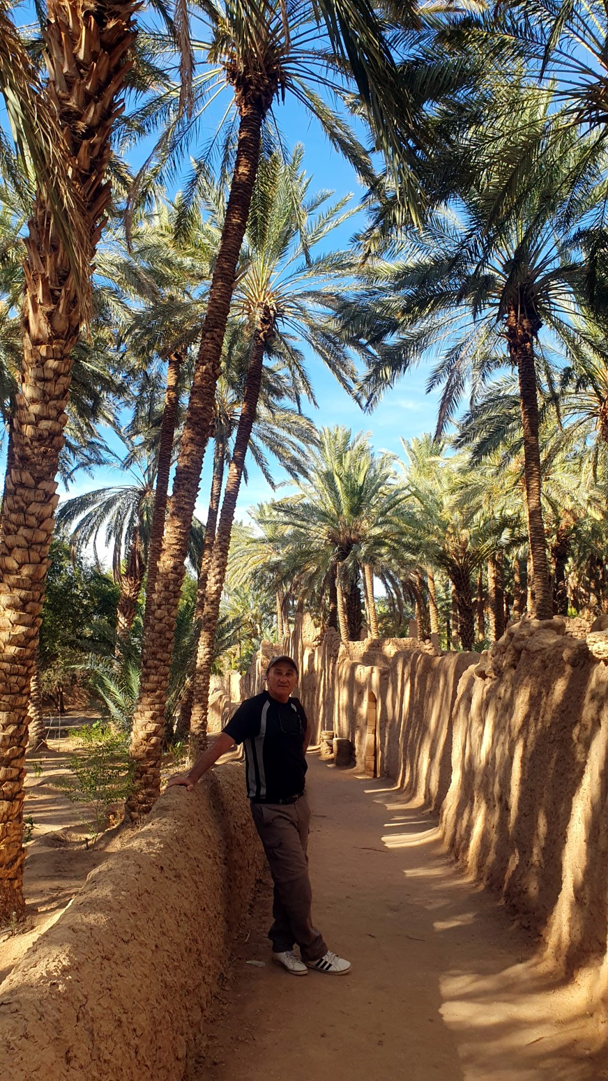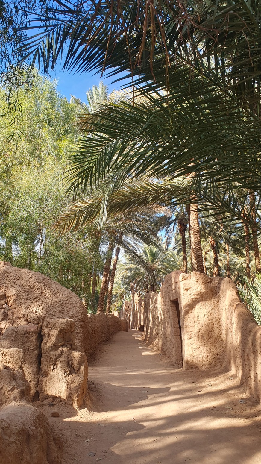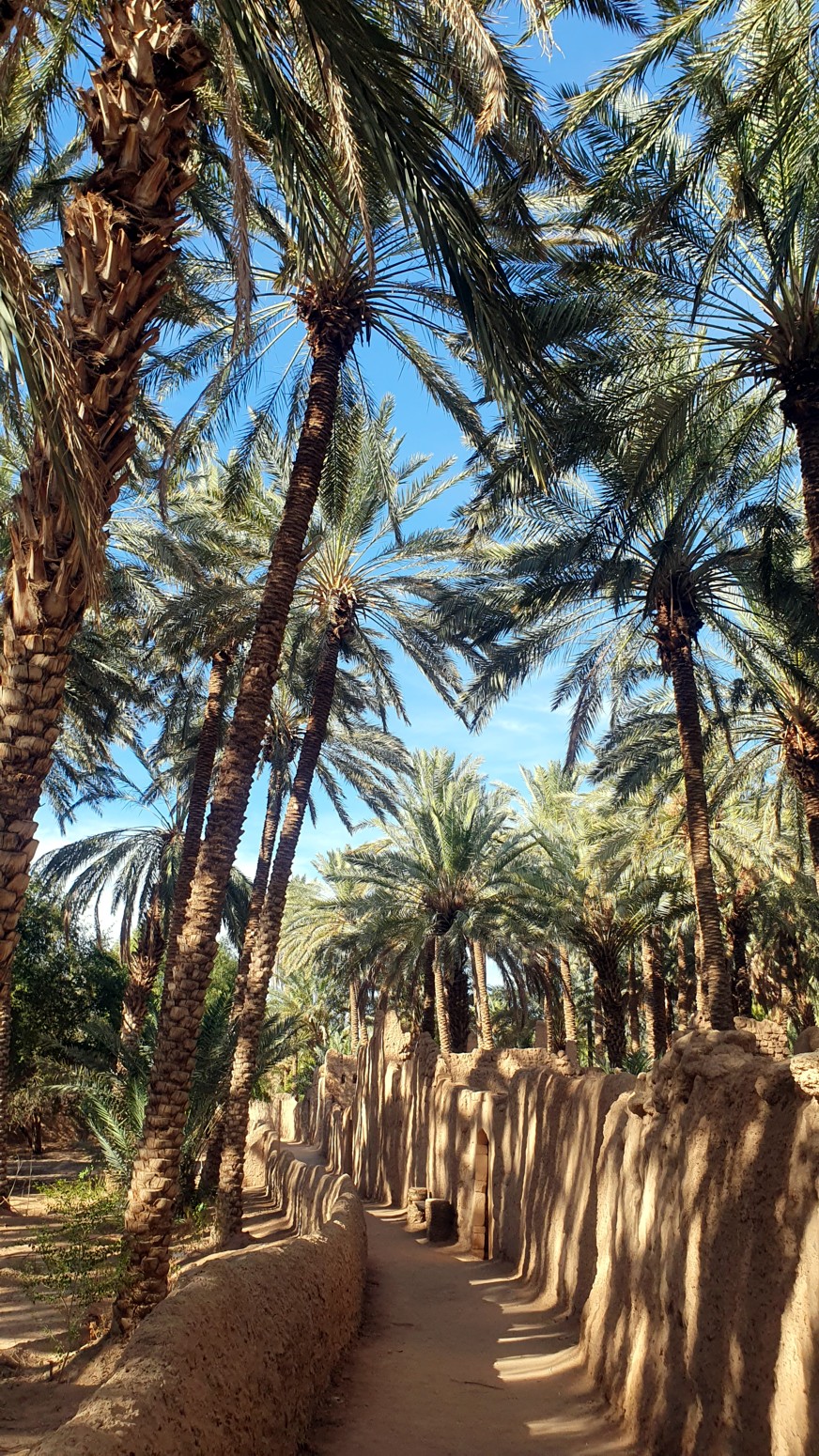 Este camino serpentea entre antiguas construcciones, palmeras datileras, huertos y sistemas de riego tradicionales que han mantenido este