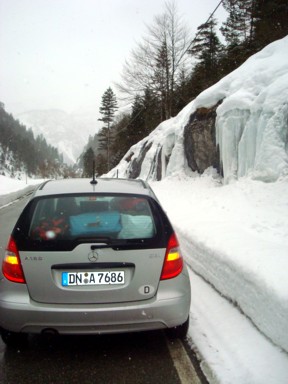 un día horrible, está nevando, y además llevamos un pequeño Mercedes clase A de