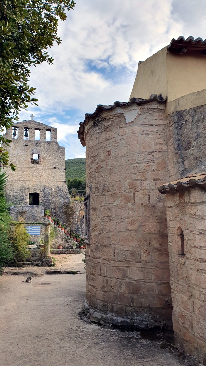 como campanario. En el centro del complejo del monasterio, hay una basílica de tres naves: el catolicon principal con hermosos frescos antiguos,