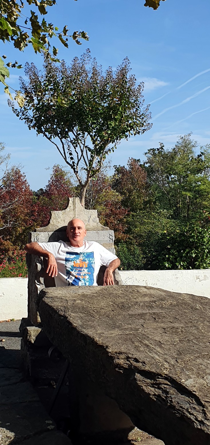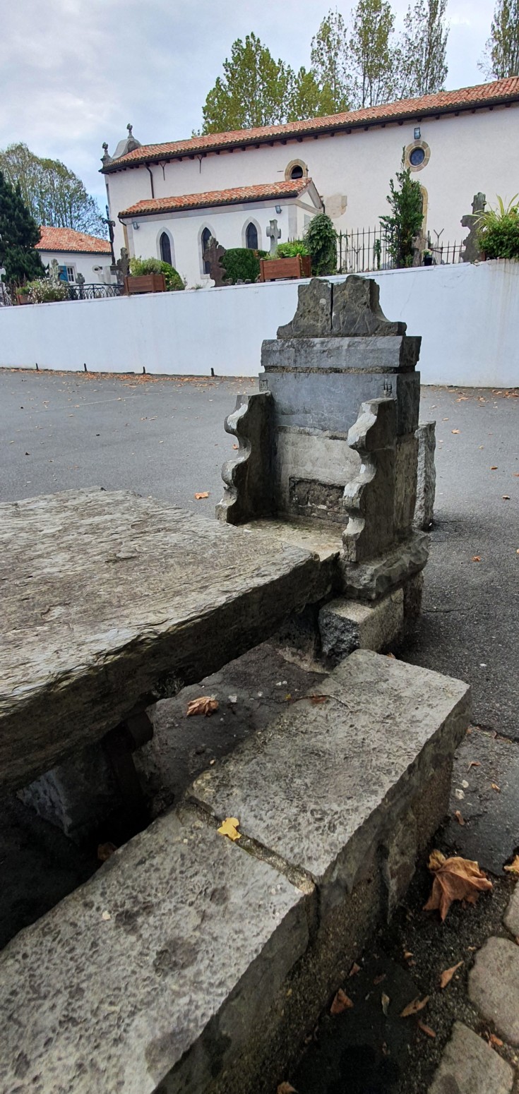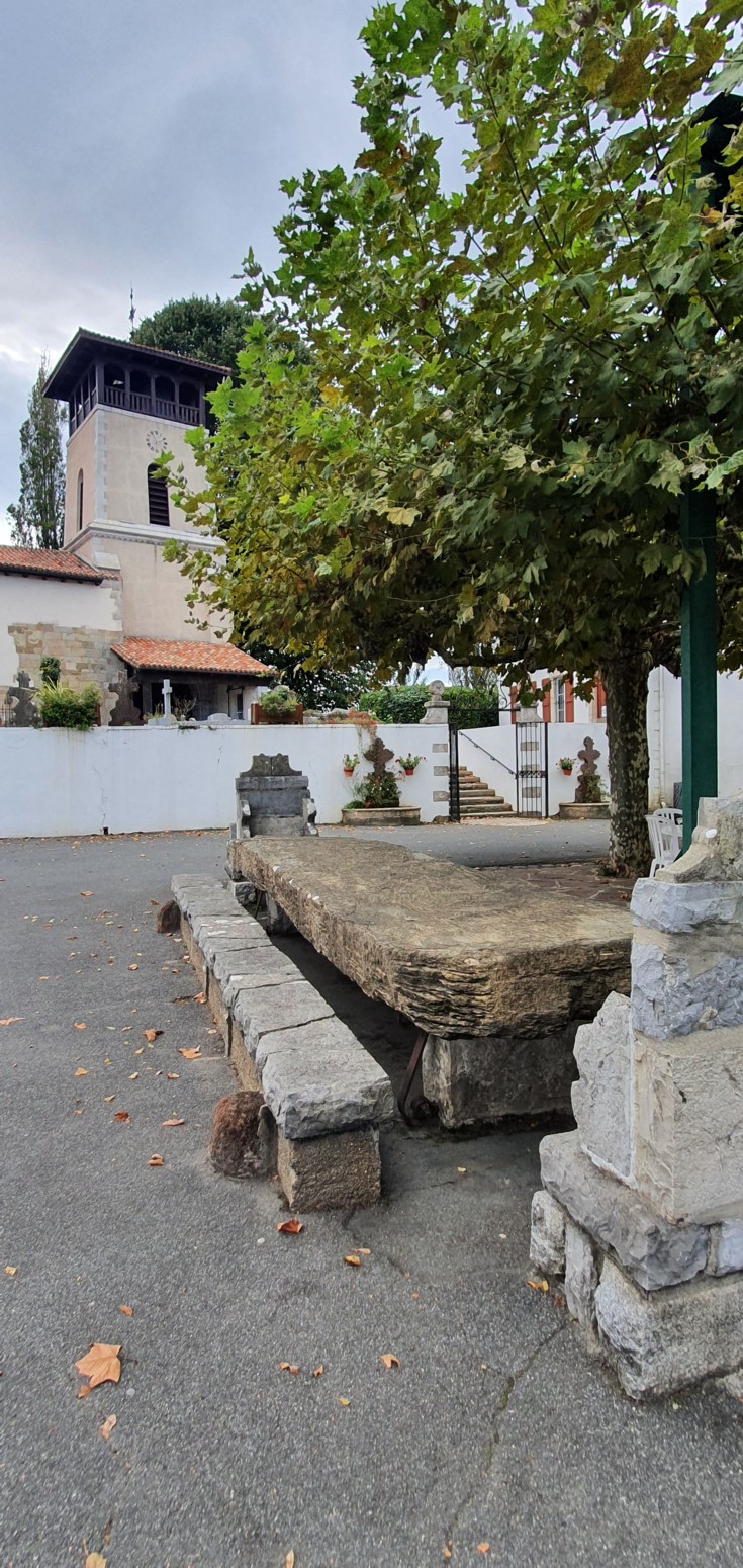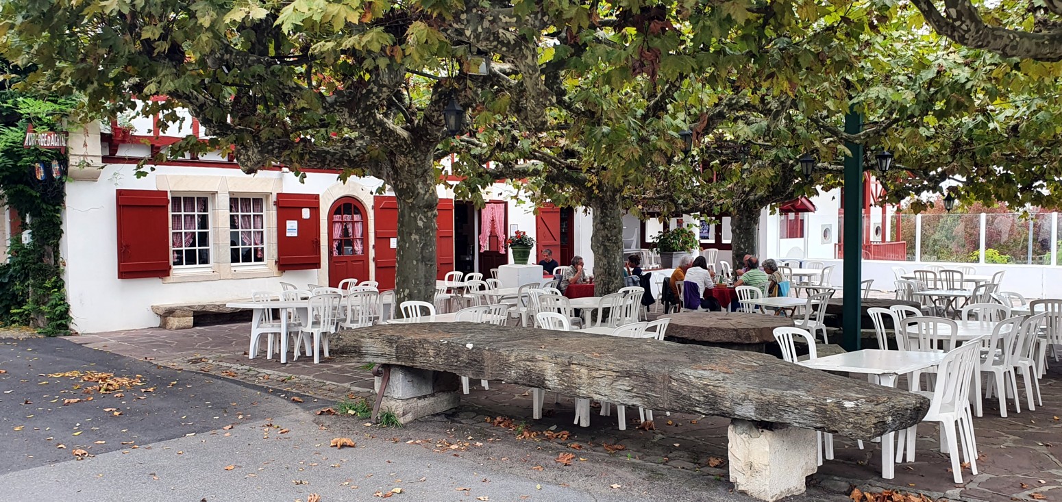 "un gran pueblo vasco ". La fachada de piedra frente a la terraza de un hostal típico, rodeada de imponentes mesas de esquisto. Cada