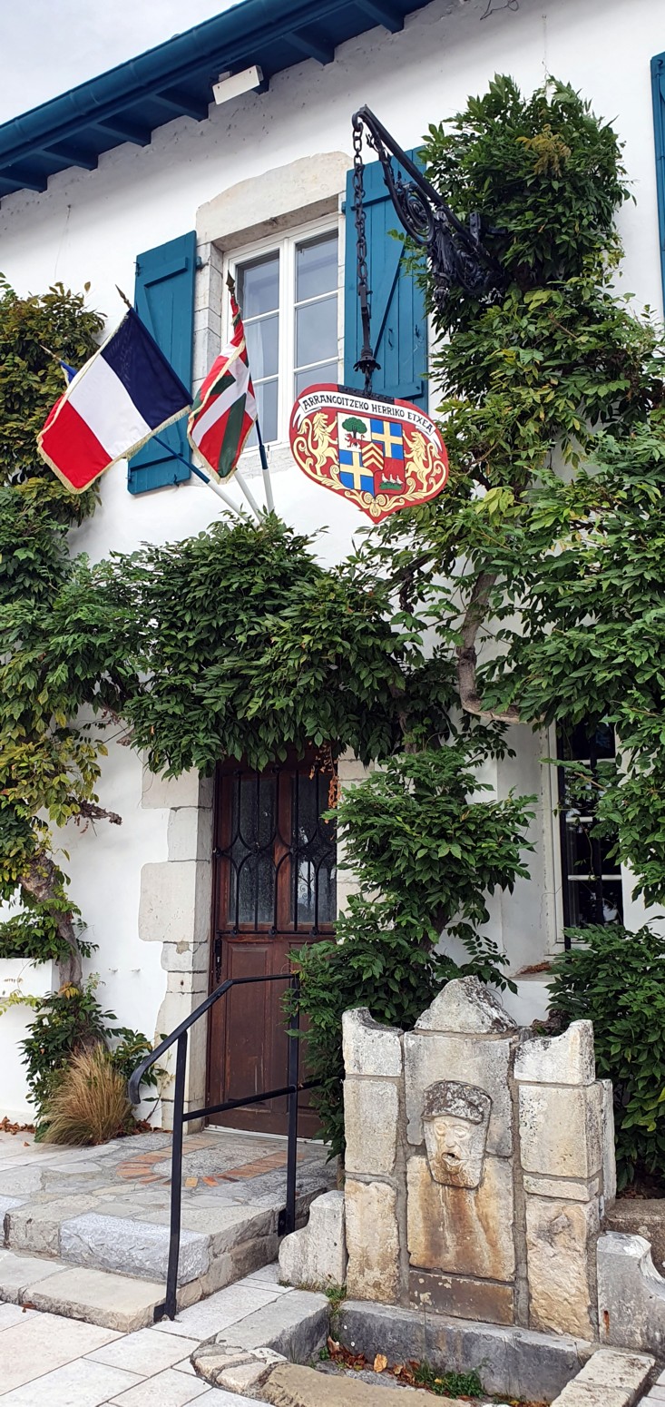 entre el ayuntamiento con contraventanas azules, la preciosa escuela, el albergue típico, el frontón de pelota vasca y la iglesia del siglo XVI con galerías