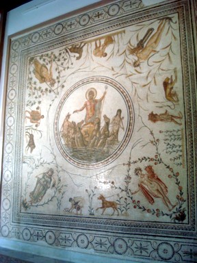 escenas, caza, pesca, guerras, dioses y diosas, fuentes con mosaicos para baño