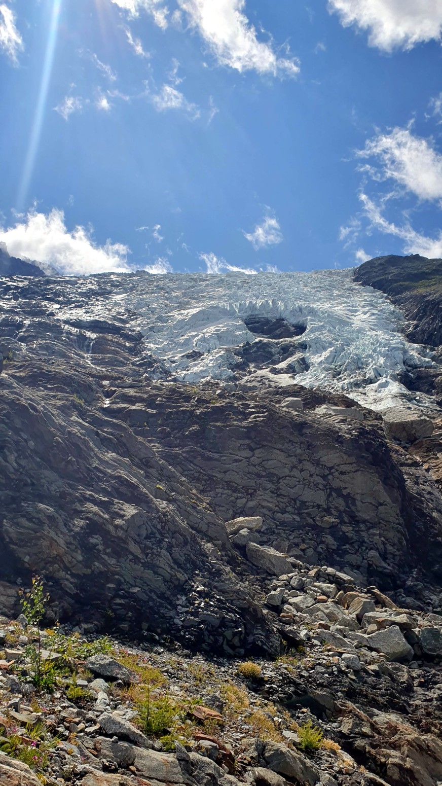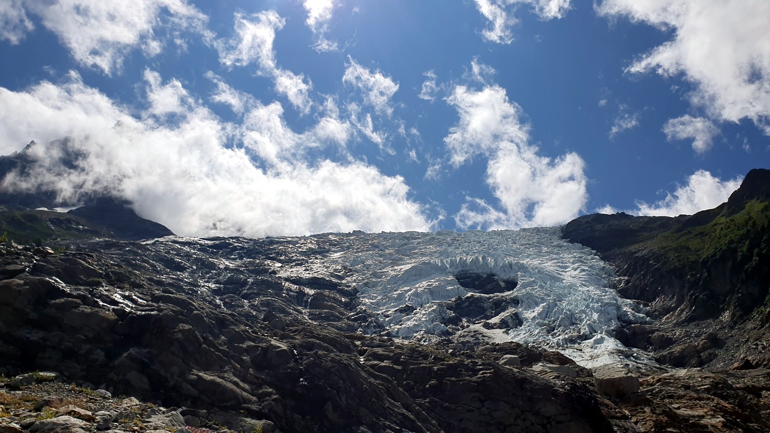 una cascada de hielo en gradas hasta una altitud de 1180 metros, la más baja de los Alpes para la lengua terminal de un