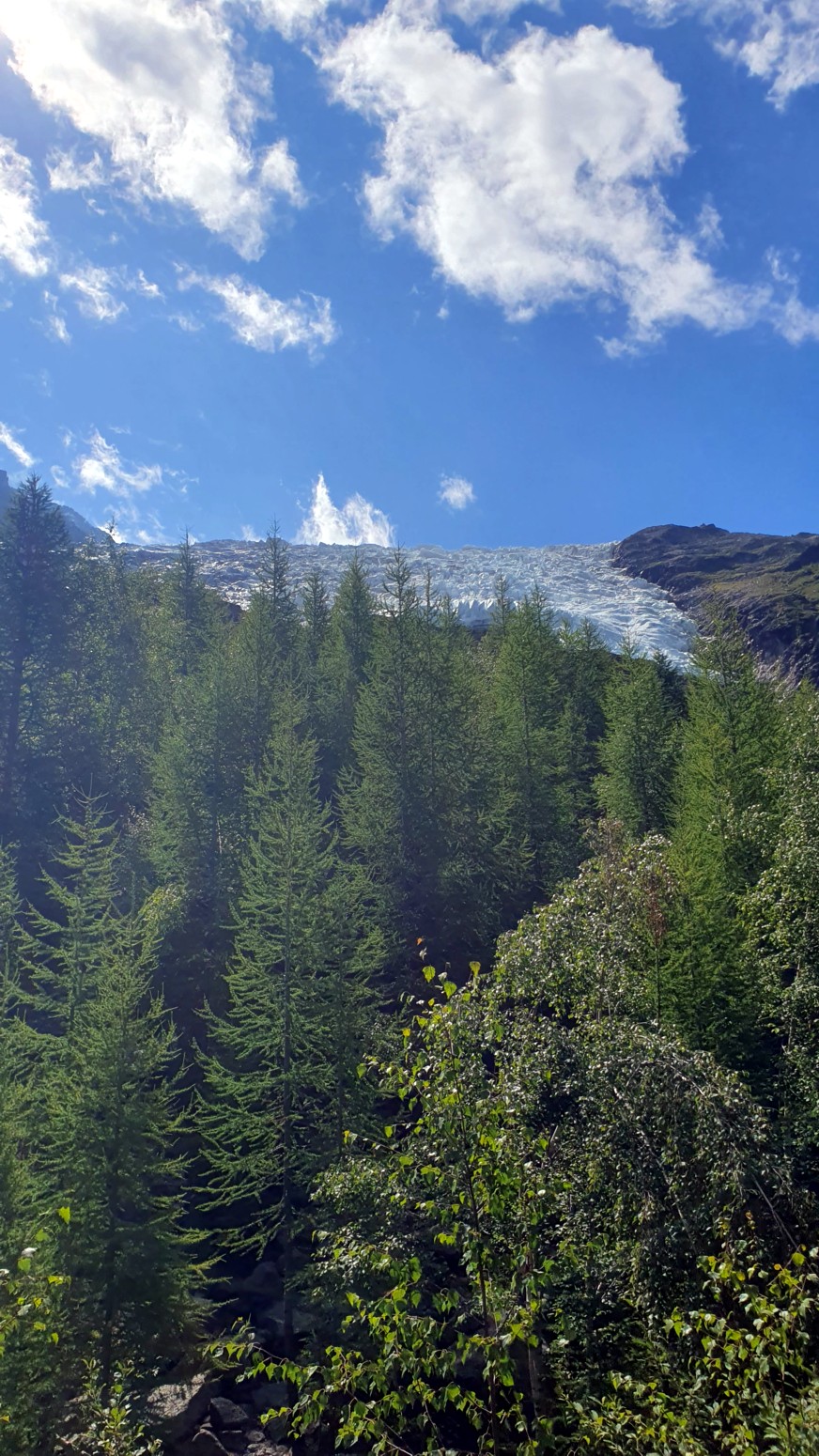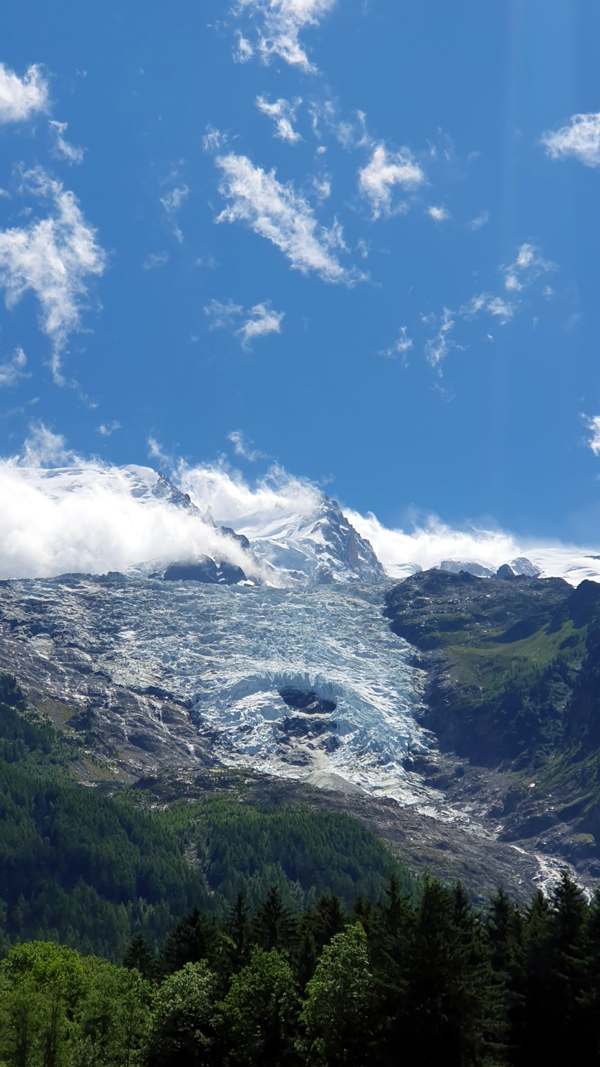 El glaciar se aprecia perfectamente desde Chamonix, y desde el pueblecito de Les Bossons, hay un pequeño telesilla que