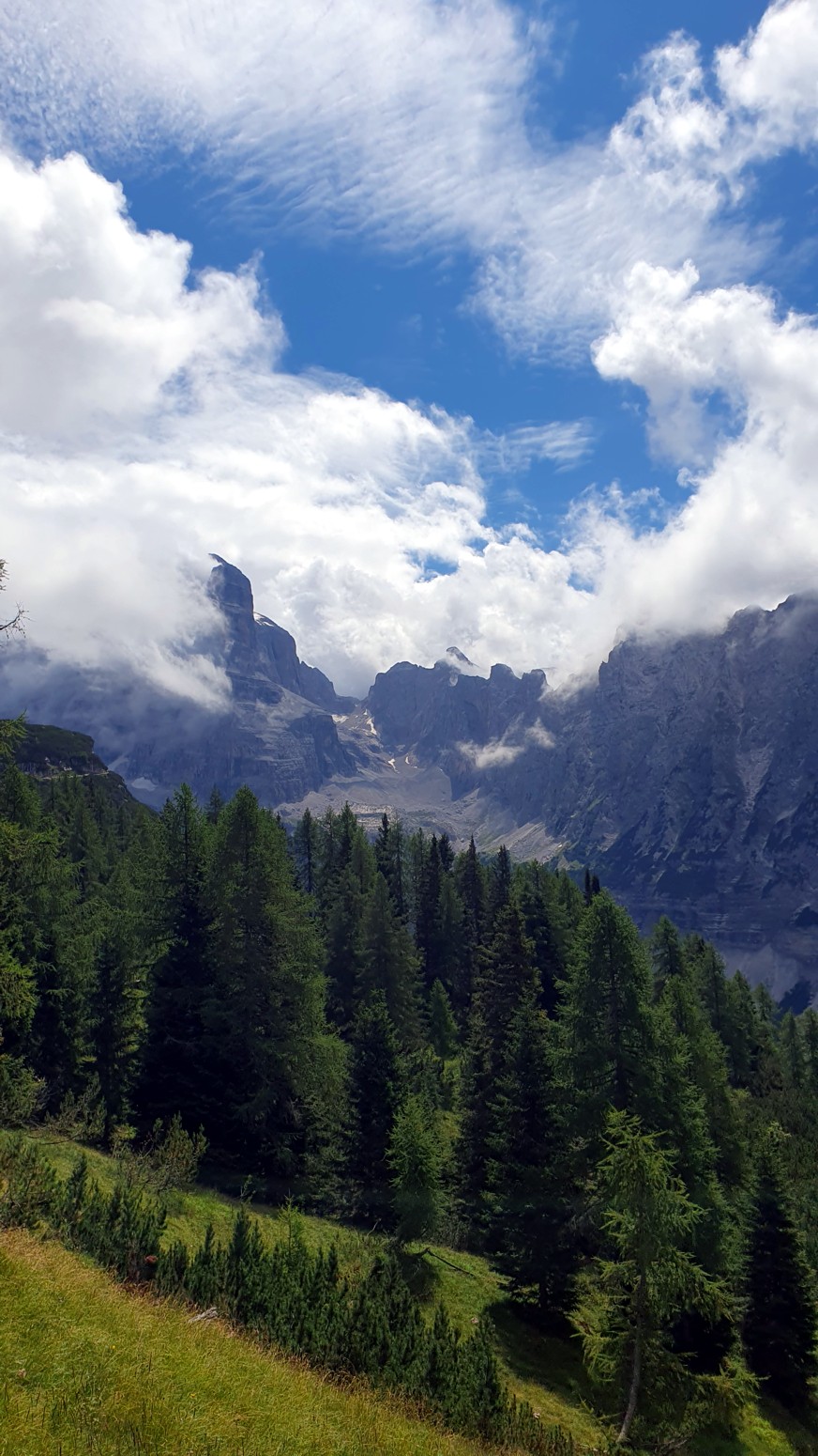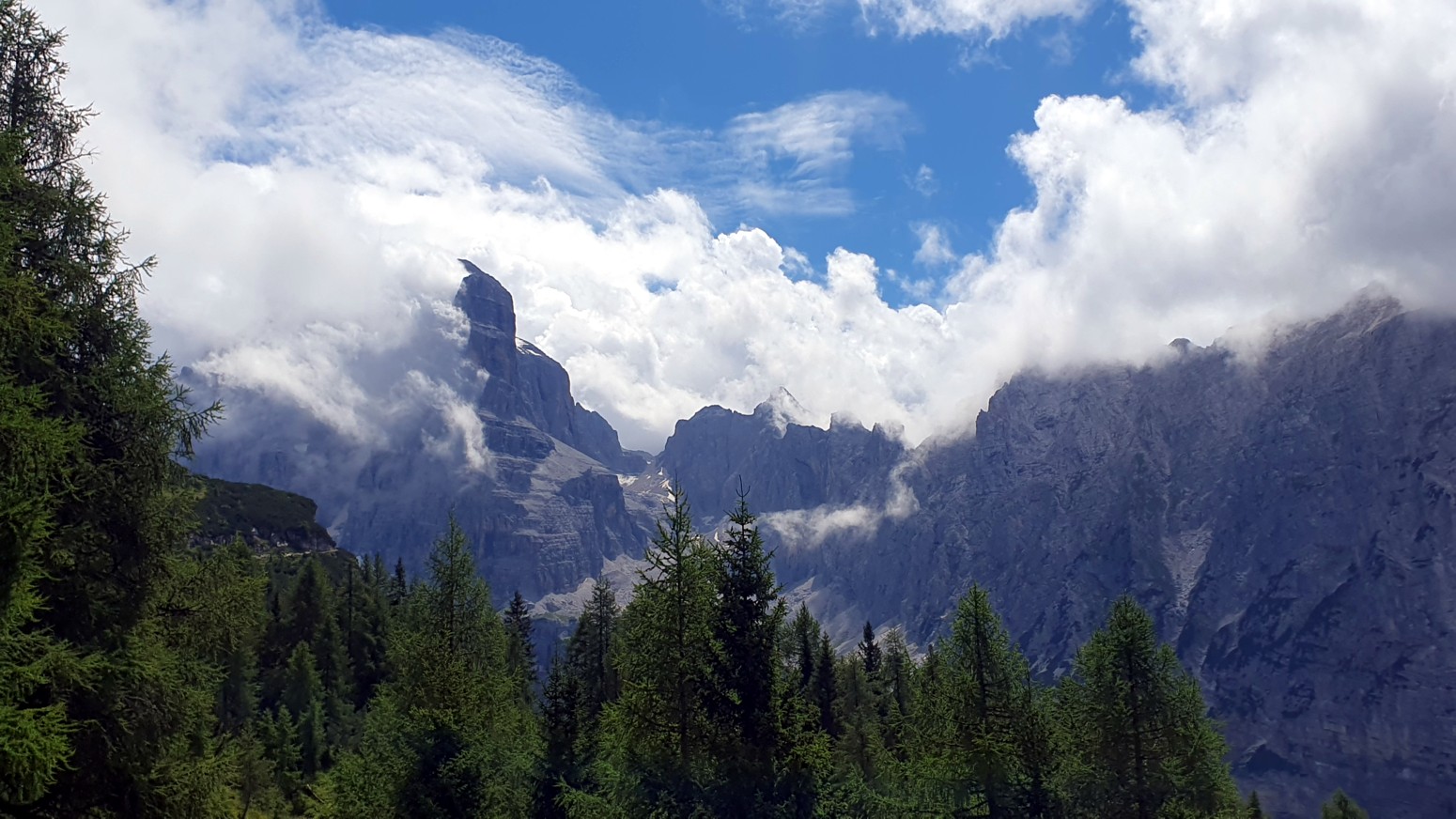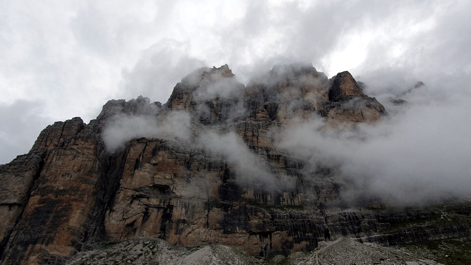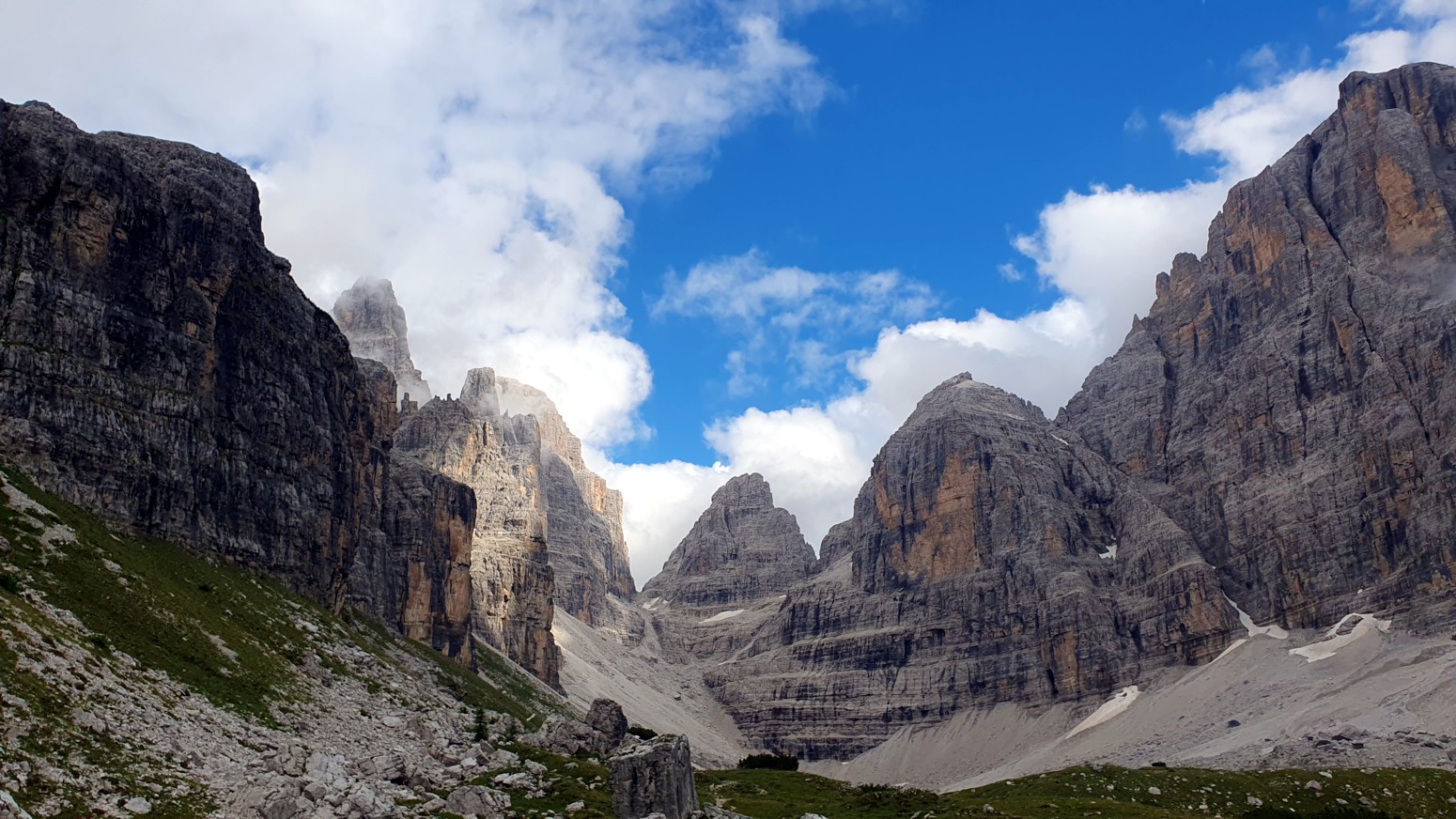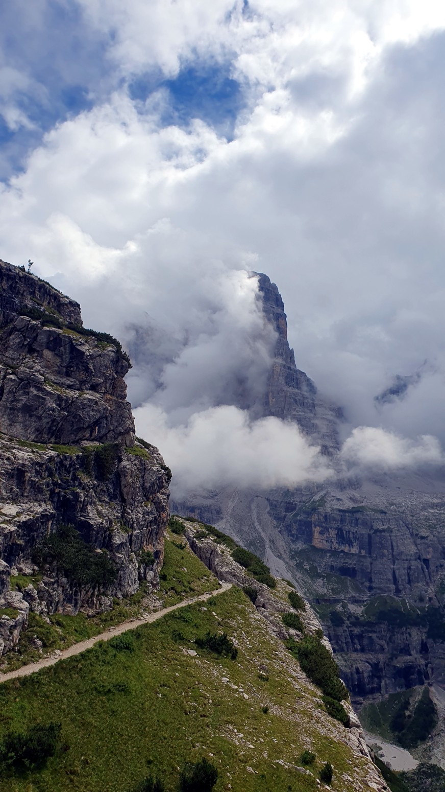 arriba a través de bosques de abetos y vistas cada vez más amplias, hasta llegar al pie de los picos más famosos de los Dolomitas de Brenta.