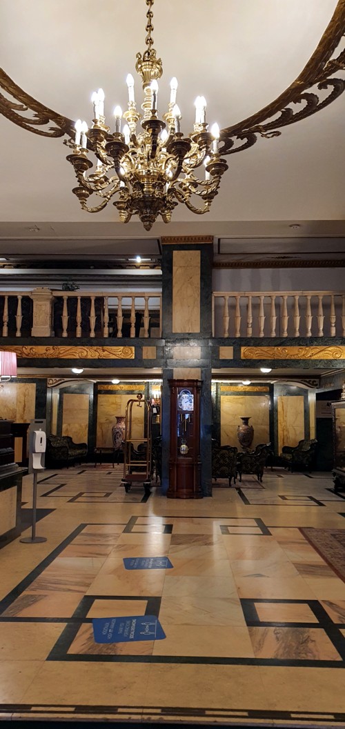 suntuosas lámparas de araña venecianas, estucos dorados y columnas