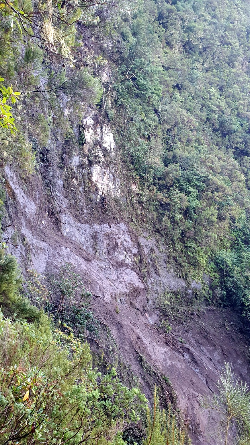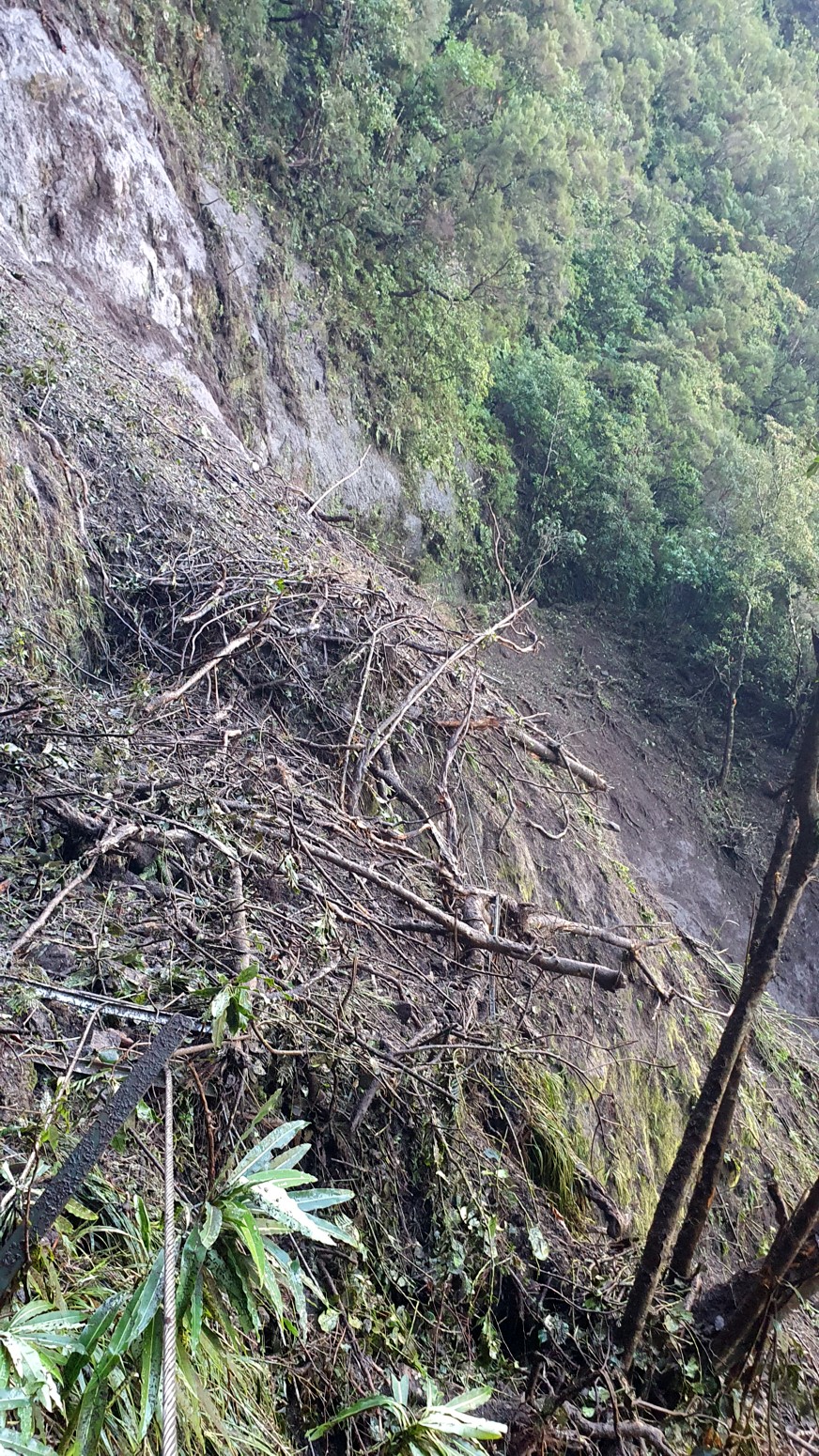 que el deslizamiento de tierra se ha llevado el camino y es muy peligroso por inestable el intentar cruzar sobre el