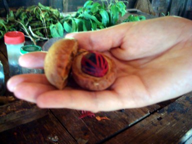 parecido al albaricoque, que se abre al madurar. La nuez moscada es la pipa de