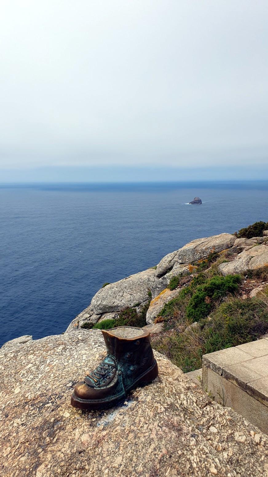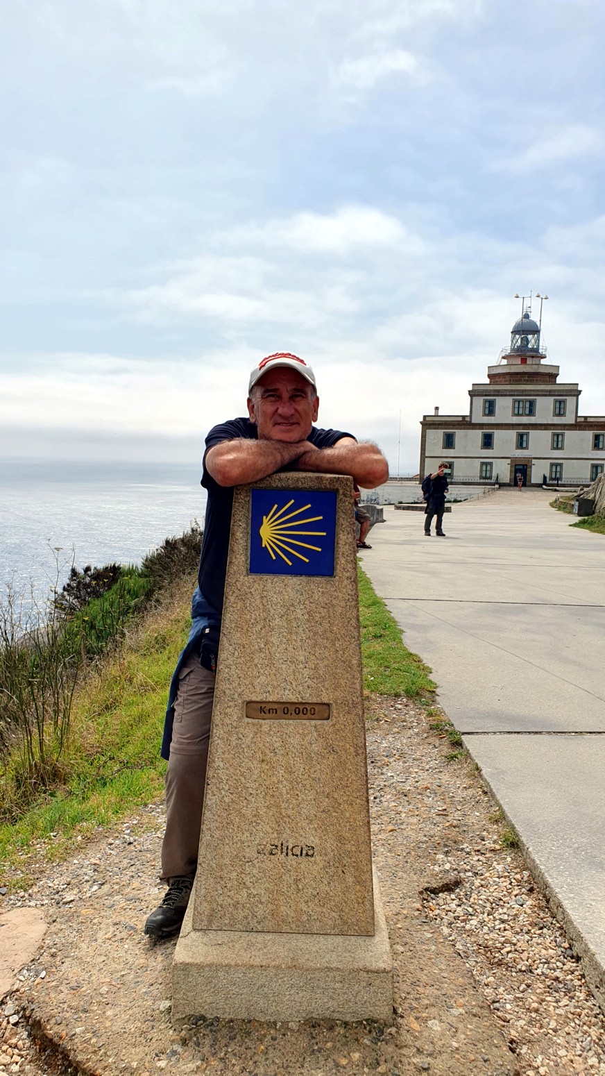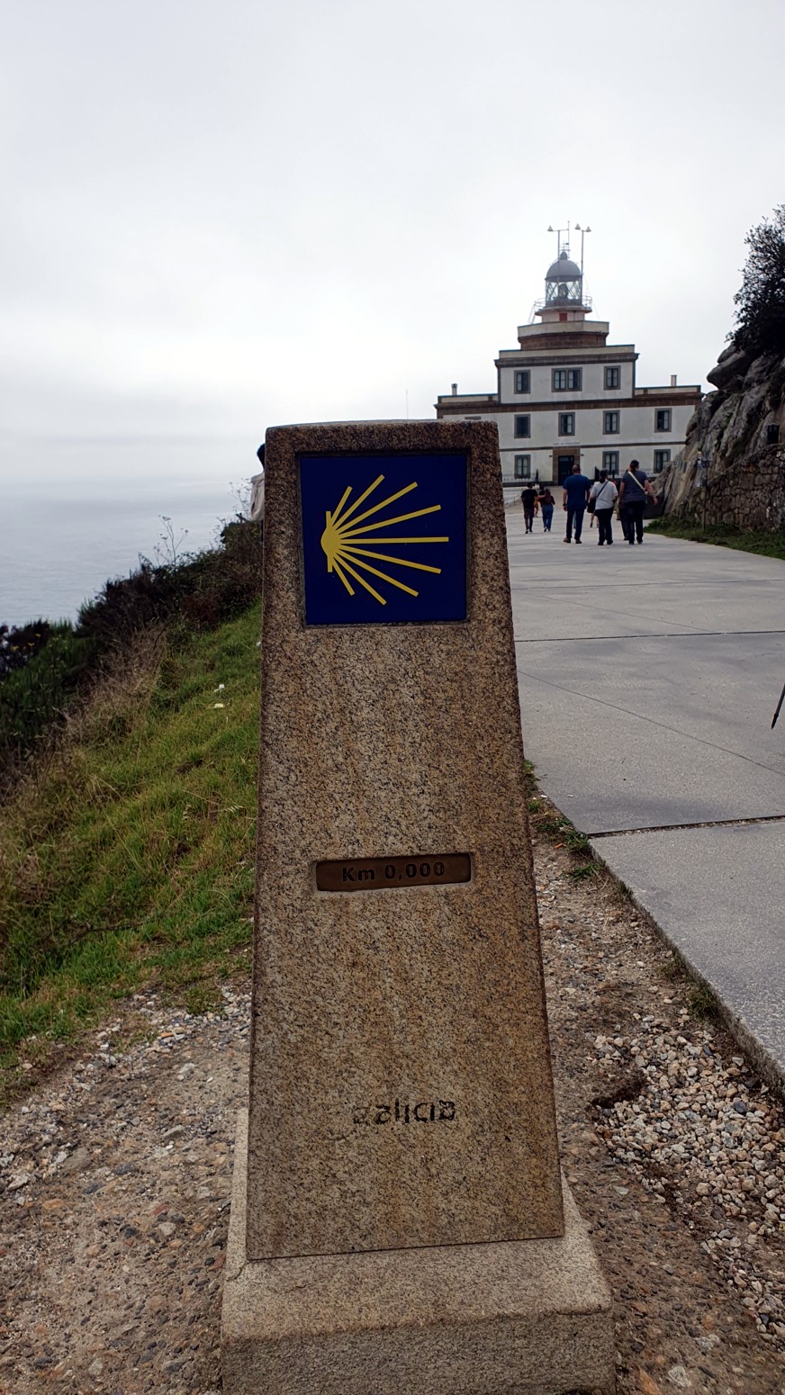 Desde Fisterra hasta el Faro, se va por siguiendo la carretera y a mitad de la subida veremos una moderna escultura de un peregrino medieval. Y ya en el faro, el mojón de los