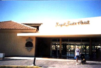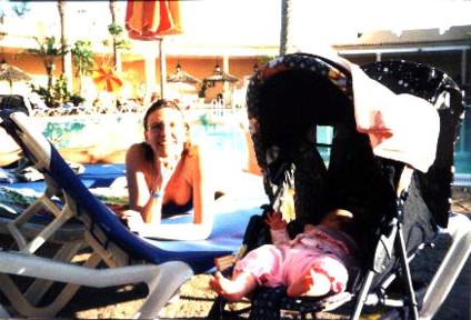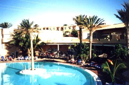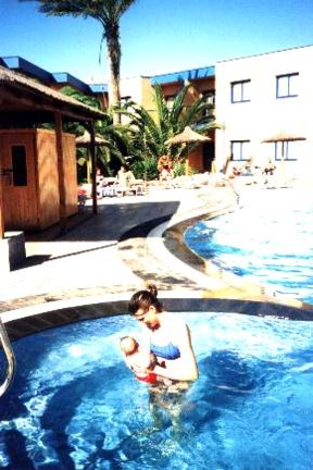 Pero si uno quiere escaparse de verdad del largo y frío invierno alemán, y ponerle ropita de manga corta al bebé, no queda más remedio que emigrar a un lugar más tropical, el más cercano sin duda las Islas Canarias, así que nos vamos a una agencia de viajes a por una verdadera "last minute" de un día para el otro, y la encontramos en la playa de Costa Calma en Fuerteventura, un estupendo hotel "all inclusive" (foto 1), en una "suite", con varias piscinas (algunas de ellas calentadas artificialmente para que nadie se quede sin bañarse), muchas palmeras (foto2), varios restaurantes y bares funcionando 24 horas, pero lo mejor ese seguro de sol que dicen tener los canarios, y que nosotros disfrutamos (fotos 3,4 y 5)...