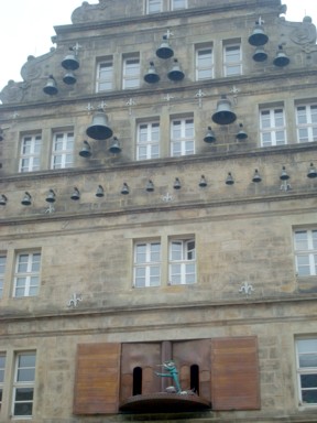 la iglesia bajo su carrusel de campanas se puede ver desfilar al flautista