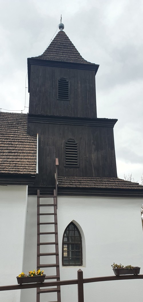 Su templo pequeño católico, cubierta de madera (chillas) y con torre de madera, se