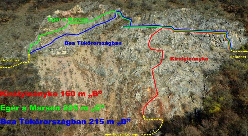 D: Bea Tükörországban (Bea en el País de las Maravillas): Un reto más duro para escaladores avanzados, 215 metros de largo. Comienza en el mismo