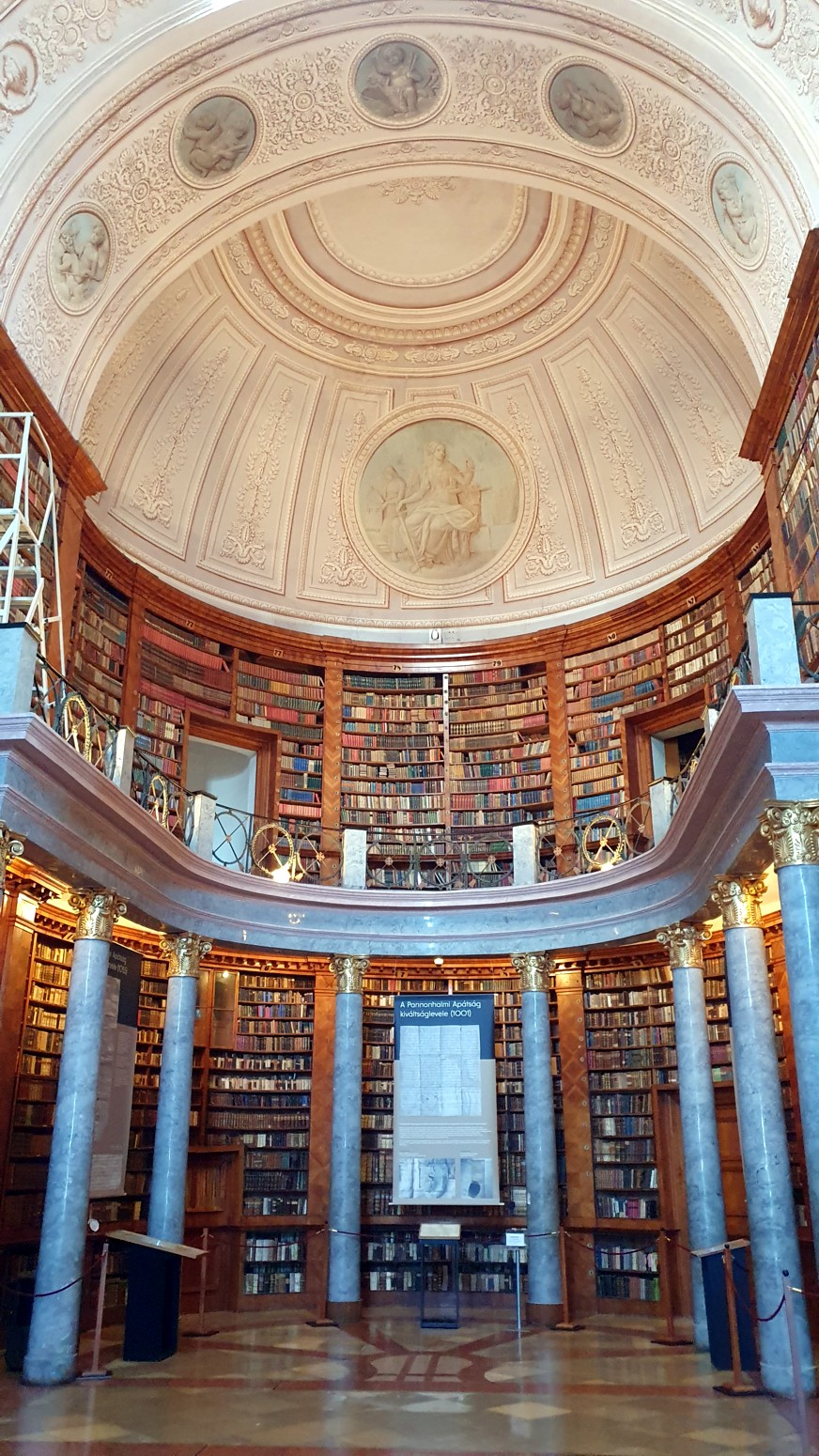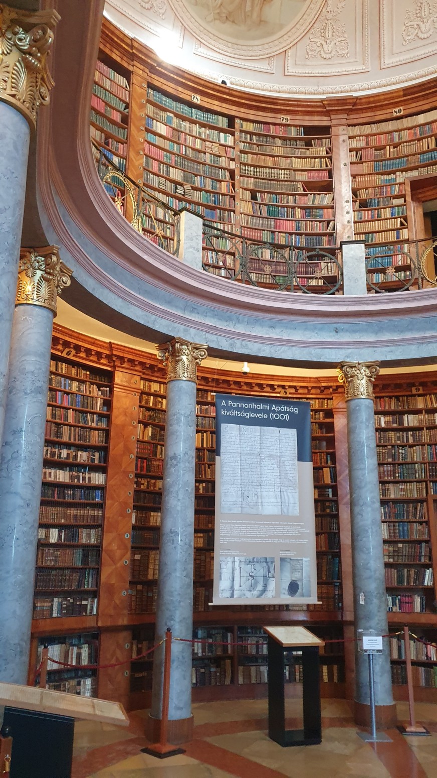 de 400.000 tomos. Las dos salas ovaladas interconectadas, con sus columnas de madera dorada y jaspeada, forman uno de los interiores más armoniosos