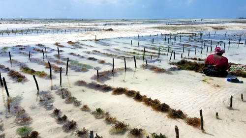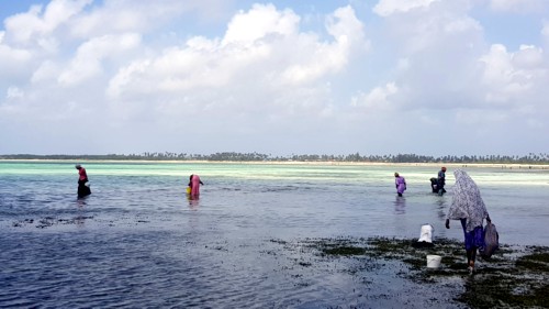 caracolas, las grandes para comer, y las pequeñas para hacer collares. Y otros sembrando unas algas, que