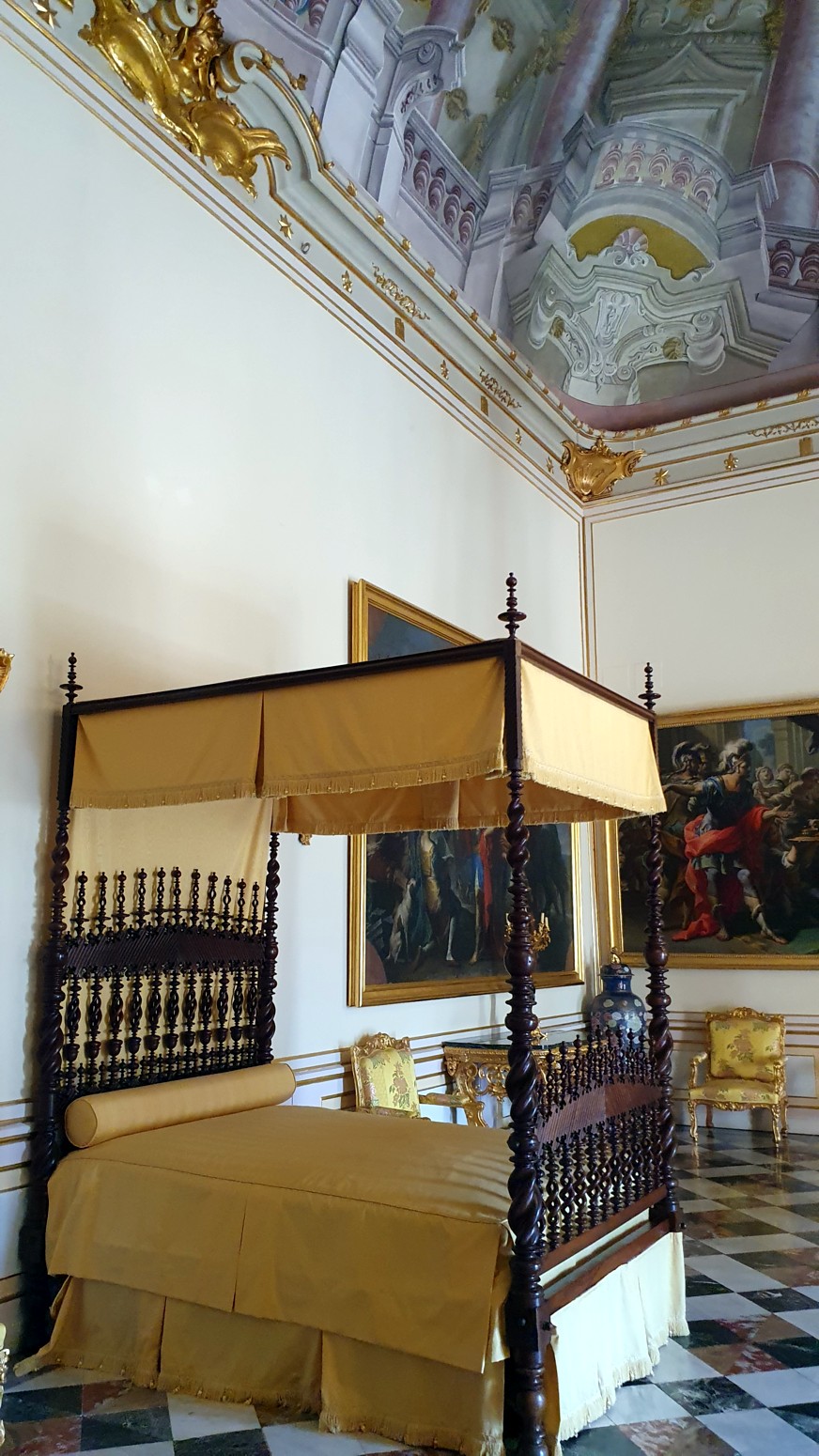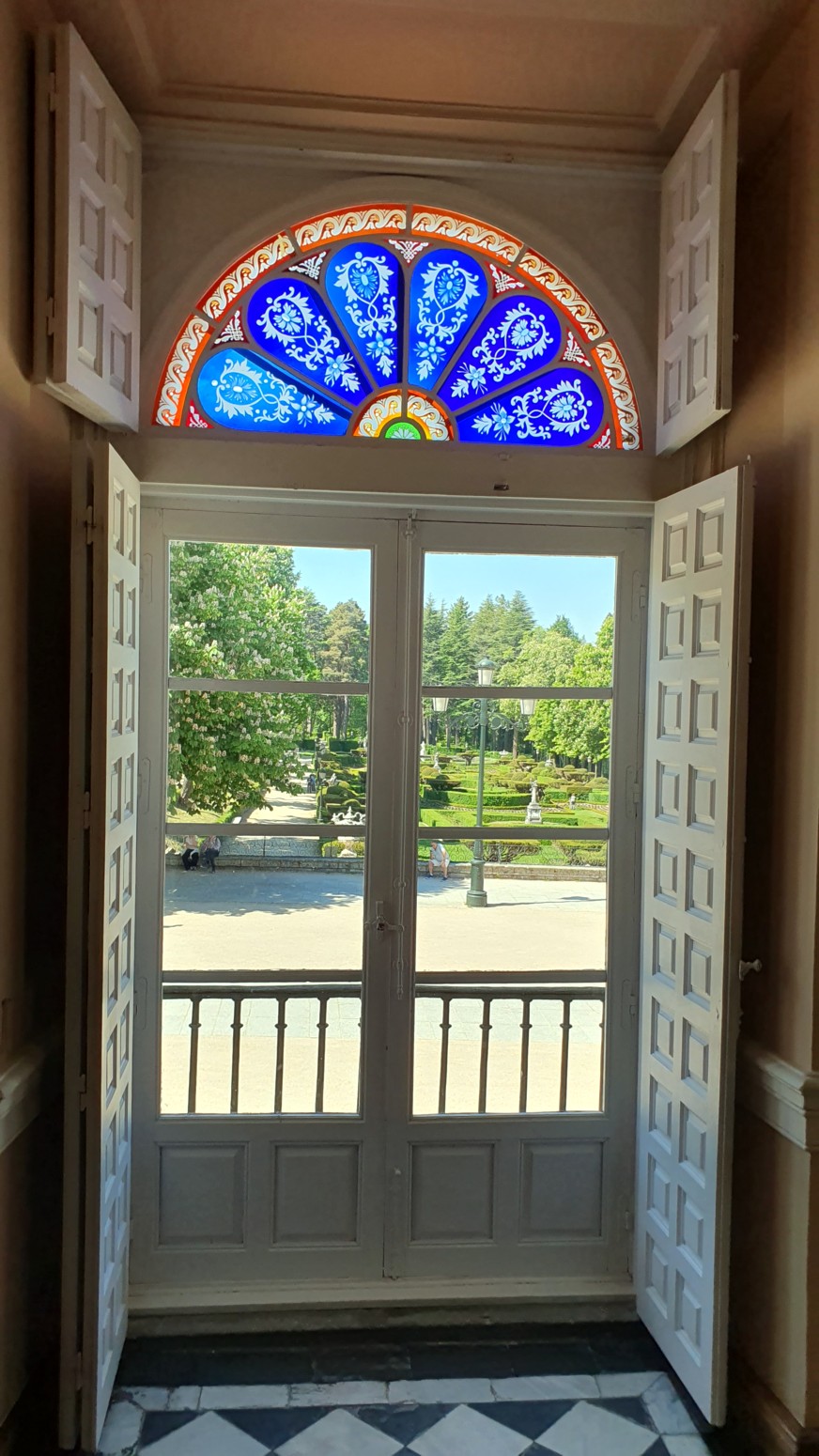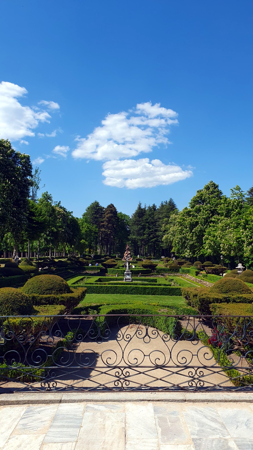 dormitorio real con su balcón a los jardines, fuentes y la magnifica vista a la sierra.