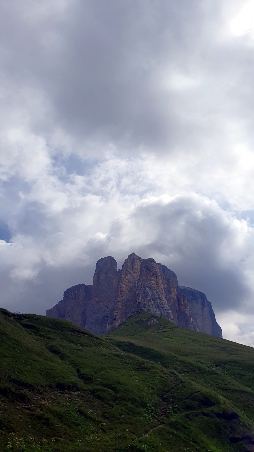 Desde el paso del Sella se pueden admirar en toda su belleza los picos del Sassolungo, la Marmolada, el Grupo del Sella y, más lejos, los