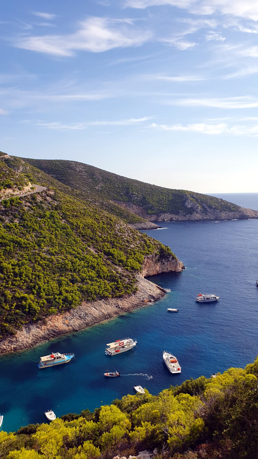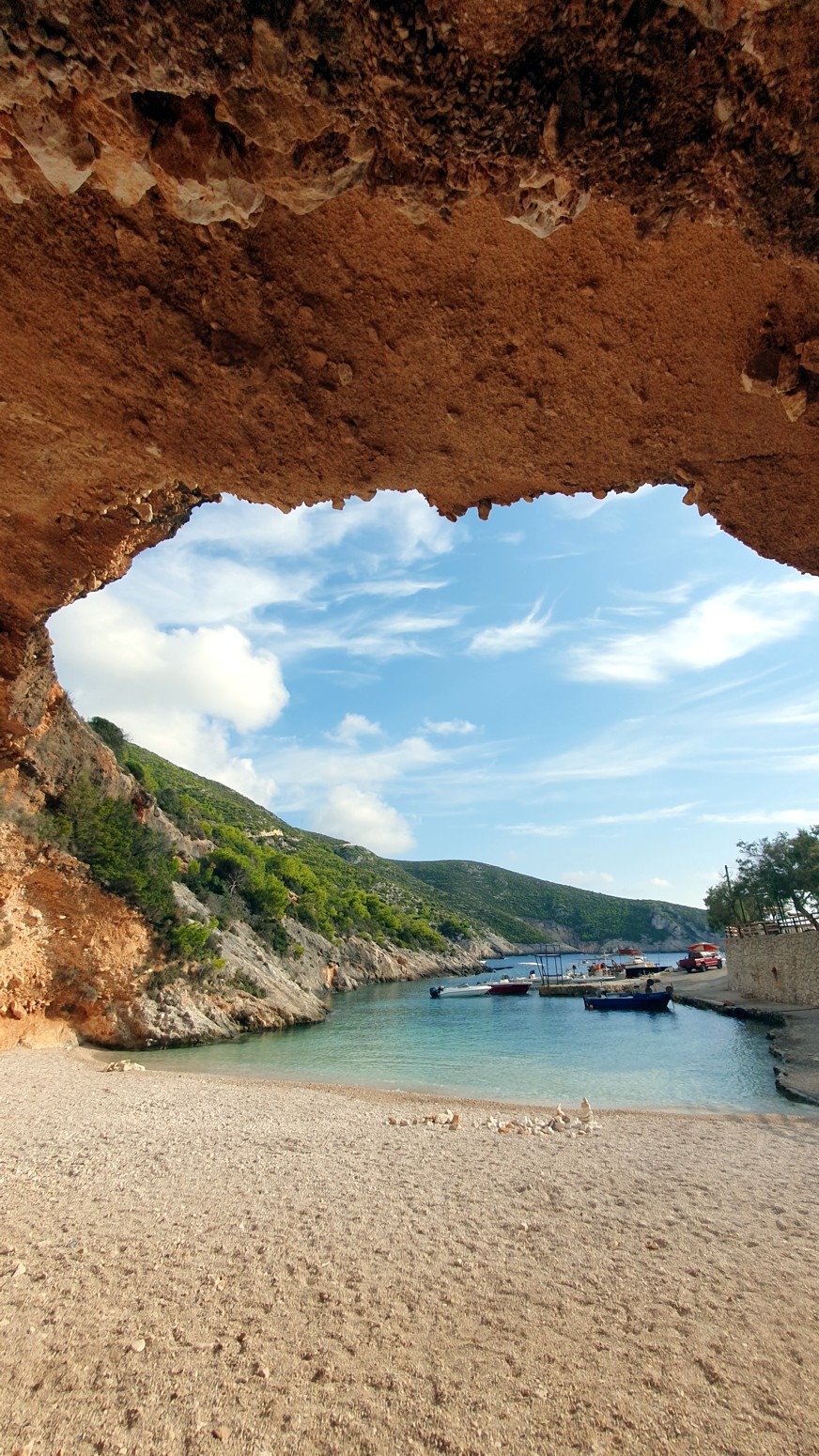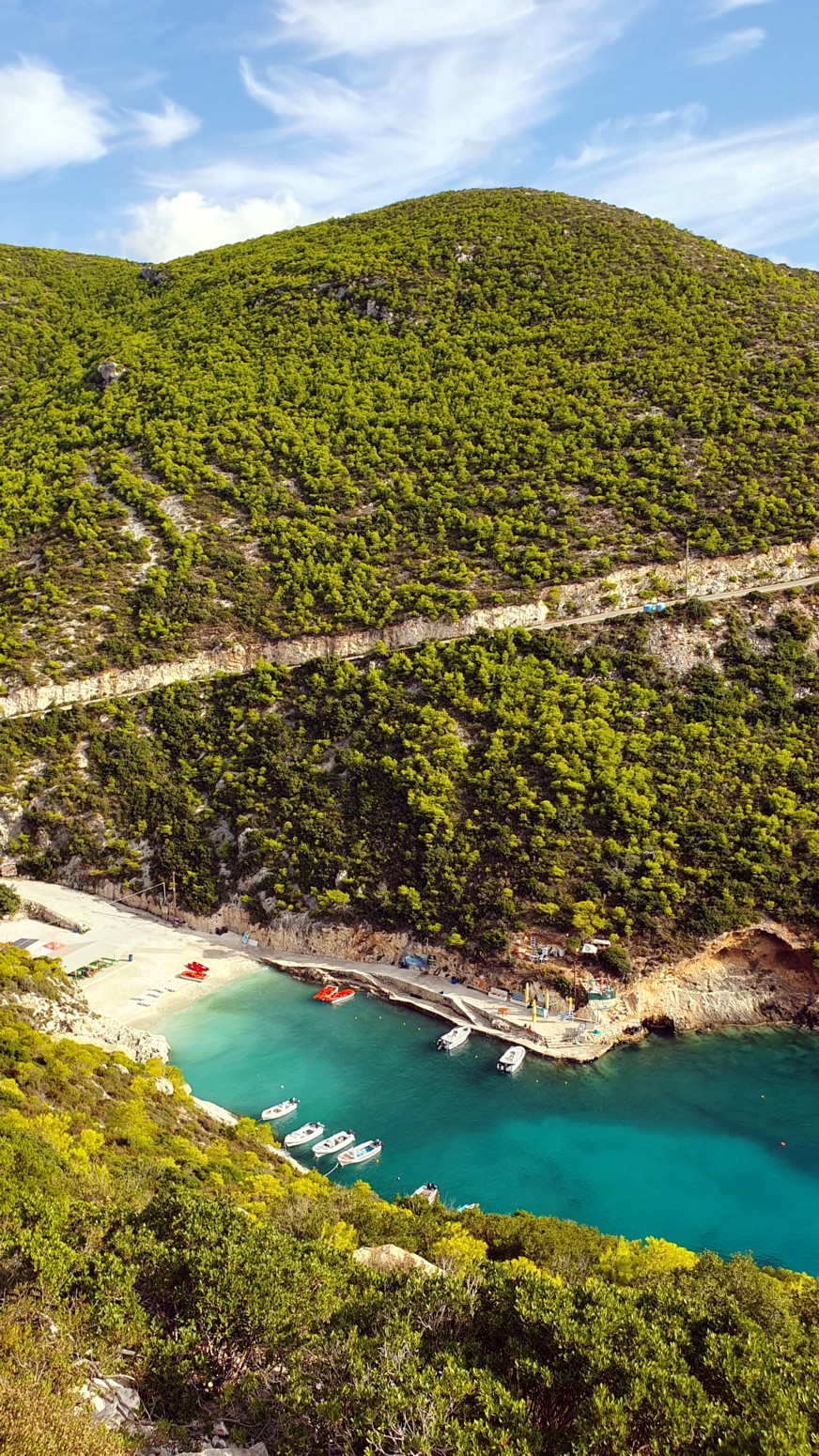 La mejor vista de Porto Vromi se abre desde arriba desde la carretera de acceso. Y desde