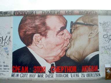 llamativa pintura del líder ruso Leonidas Brezhnev besando a Erich Honecker,