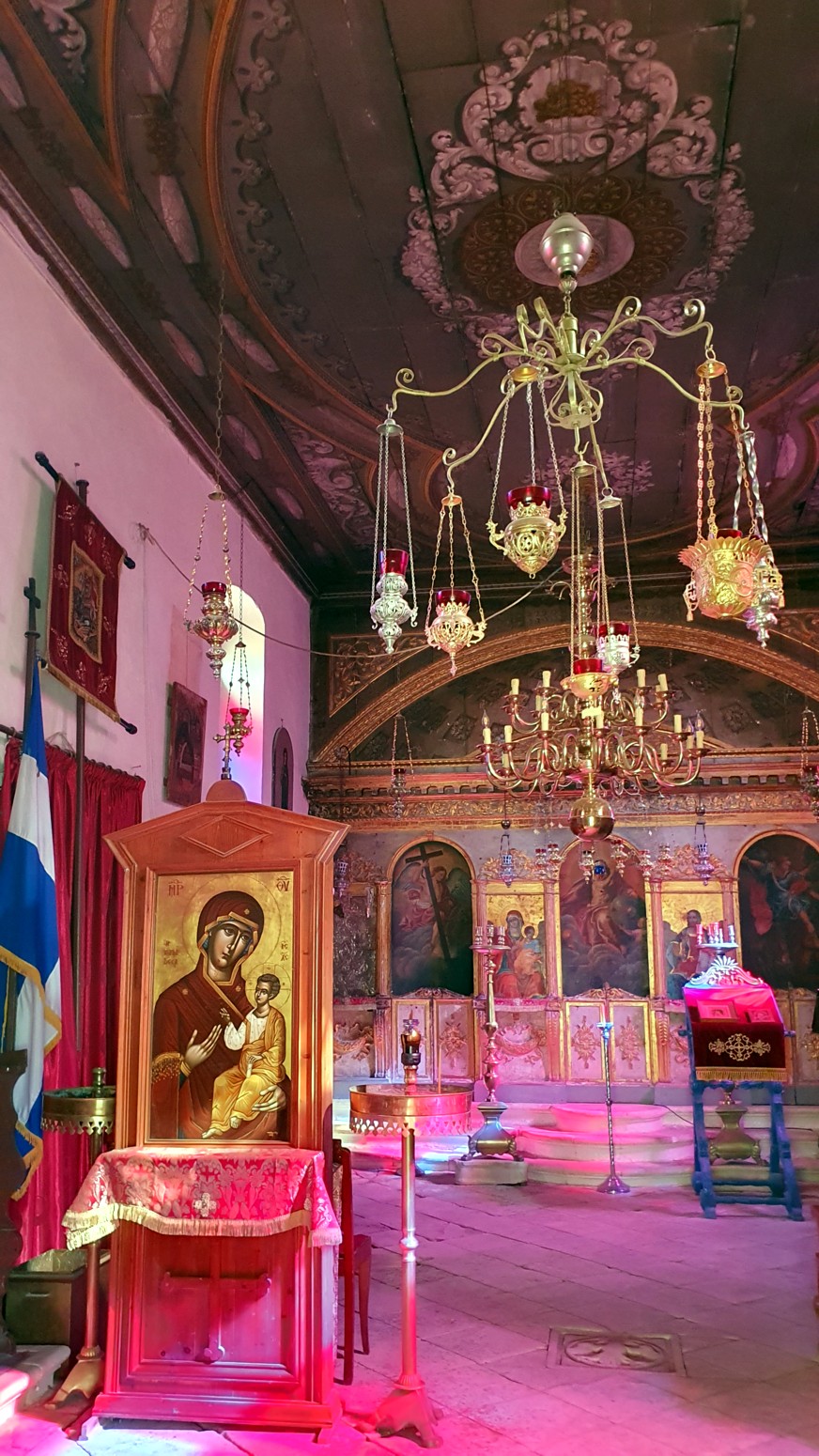 El katholikon (iglesia principal) del monasterio fue decorado con pinturas murales de Loukas Romanos en 1606, pero desafortunadamente, estas