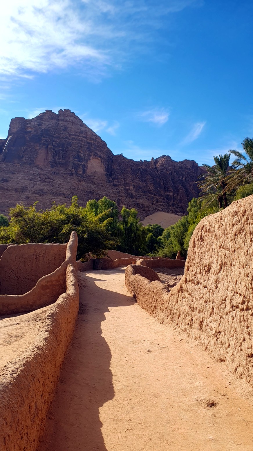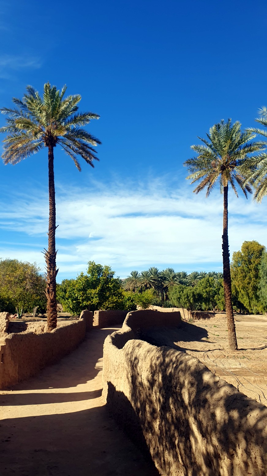 Este camino serpentea entre antiguas construcciones, palmeras datileras, huertos y sistemas de riego tradicionales que han mantenido este