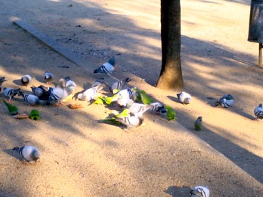 todas las plazas están llenas de palomas, y ahora también de loros, que parece