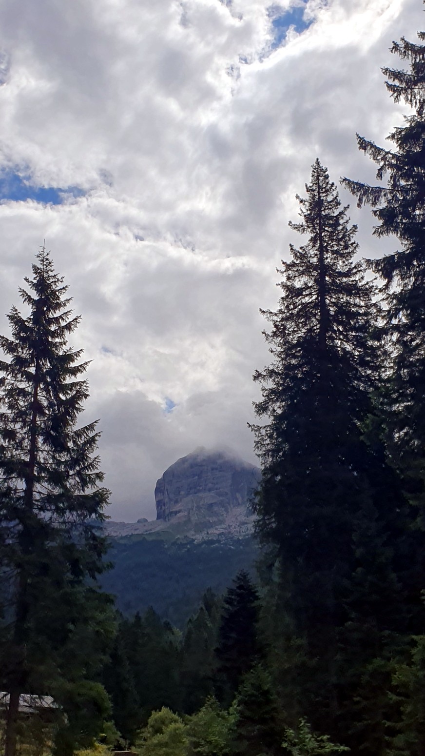arriba a través de bosques de abetos y vistas cada vez más amplias, hasta llegar al pie de los picos más famosos de los Dolomitas de Brenta.