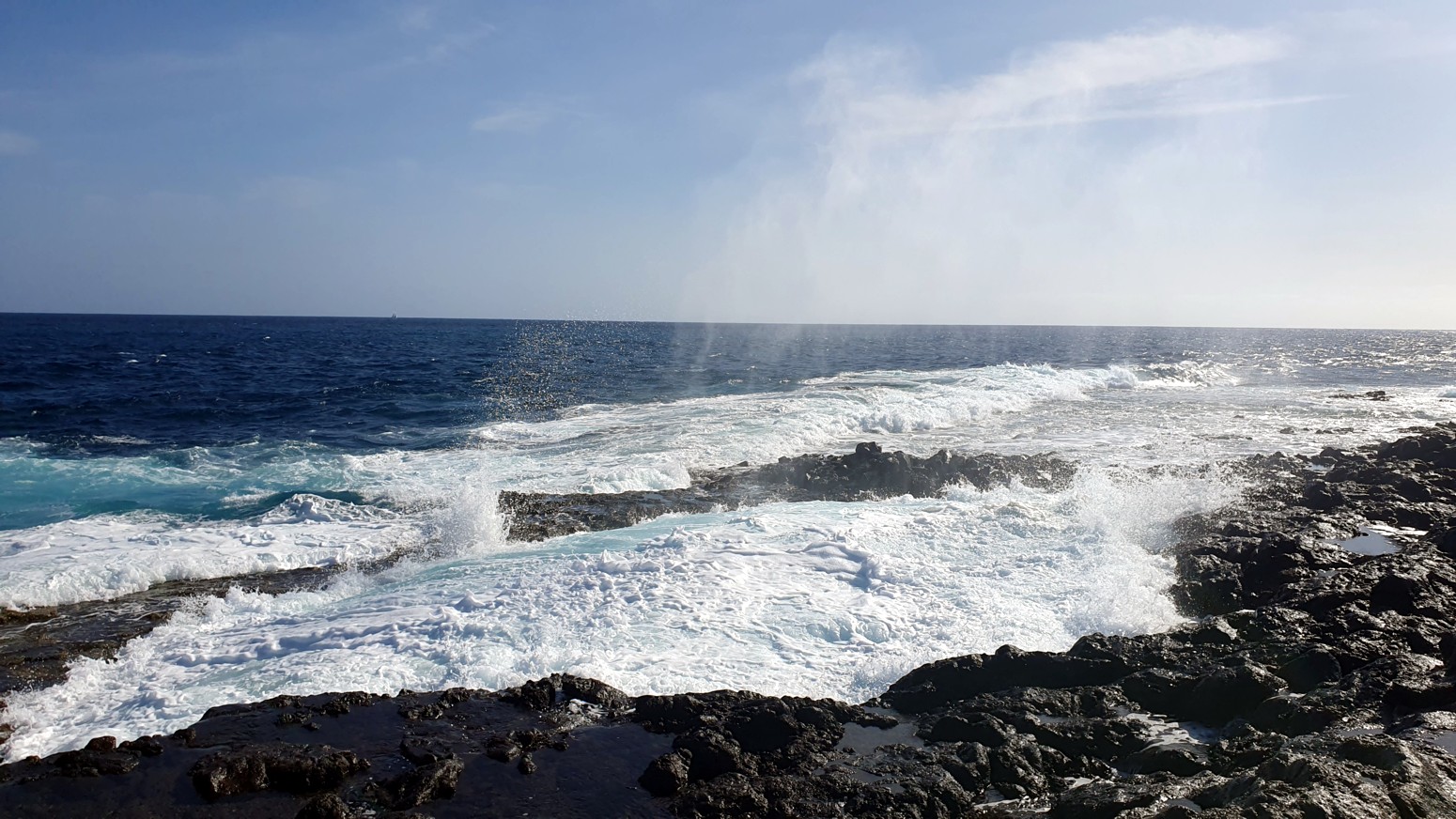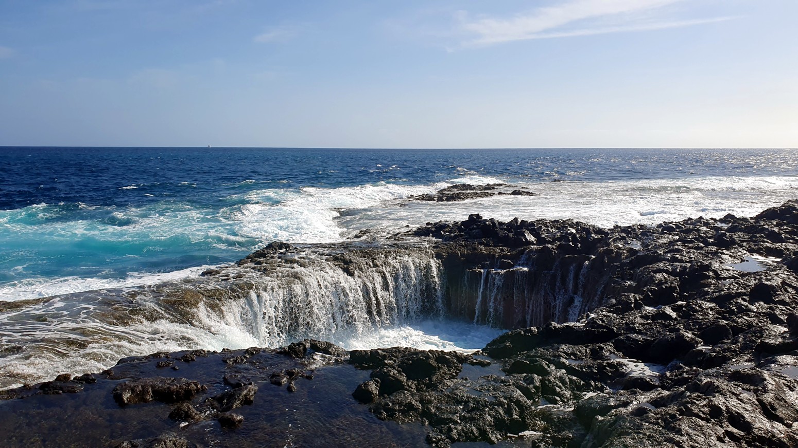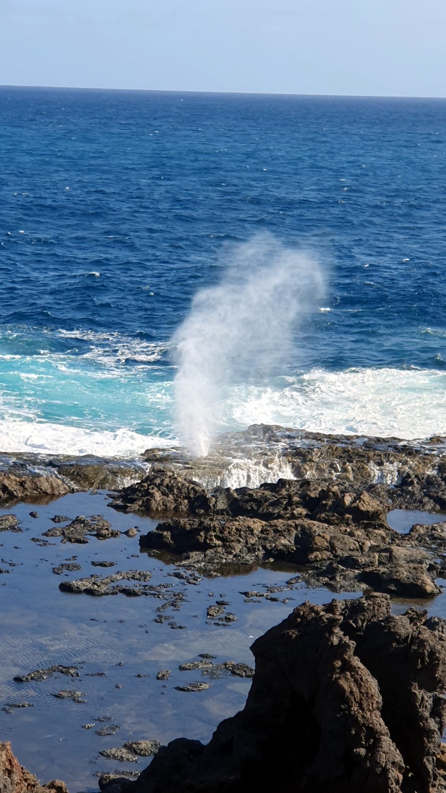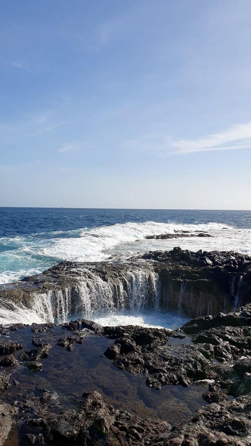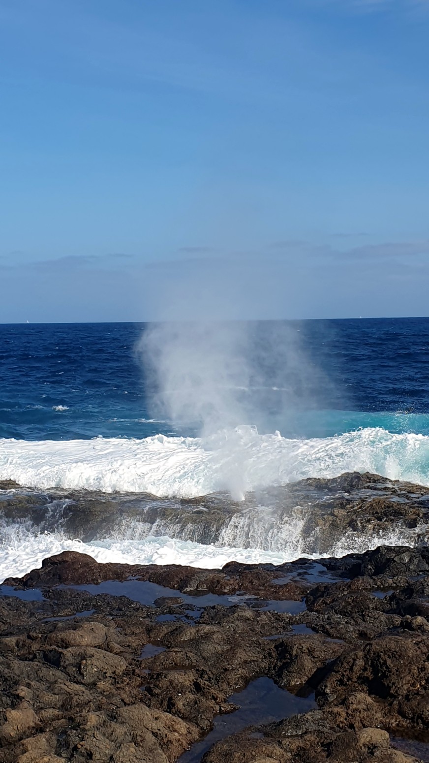 una chimenea natural donde el agua sale despedida hacia arriba por el hueco a modo de géiser y produciendo un sonido