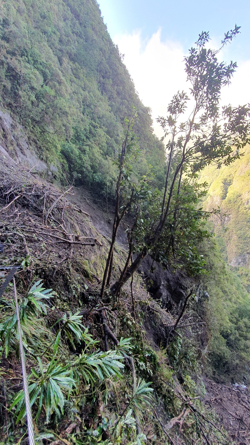 que el deslizamiento de tierra se ha llevado el camino y es muy peligroso por inestable el intentar cruzar sobre el