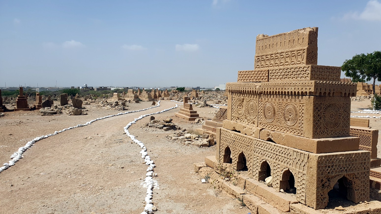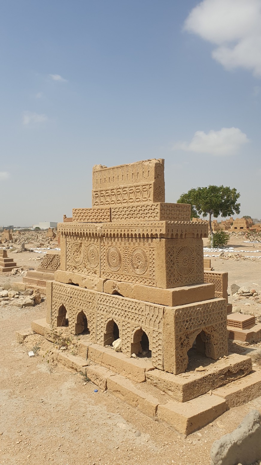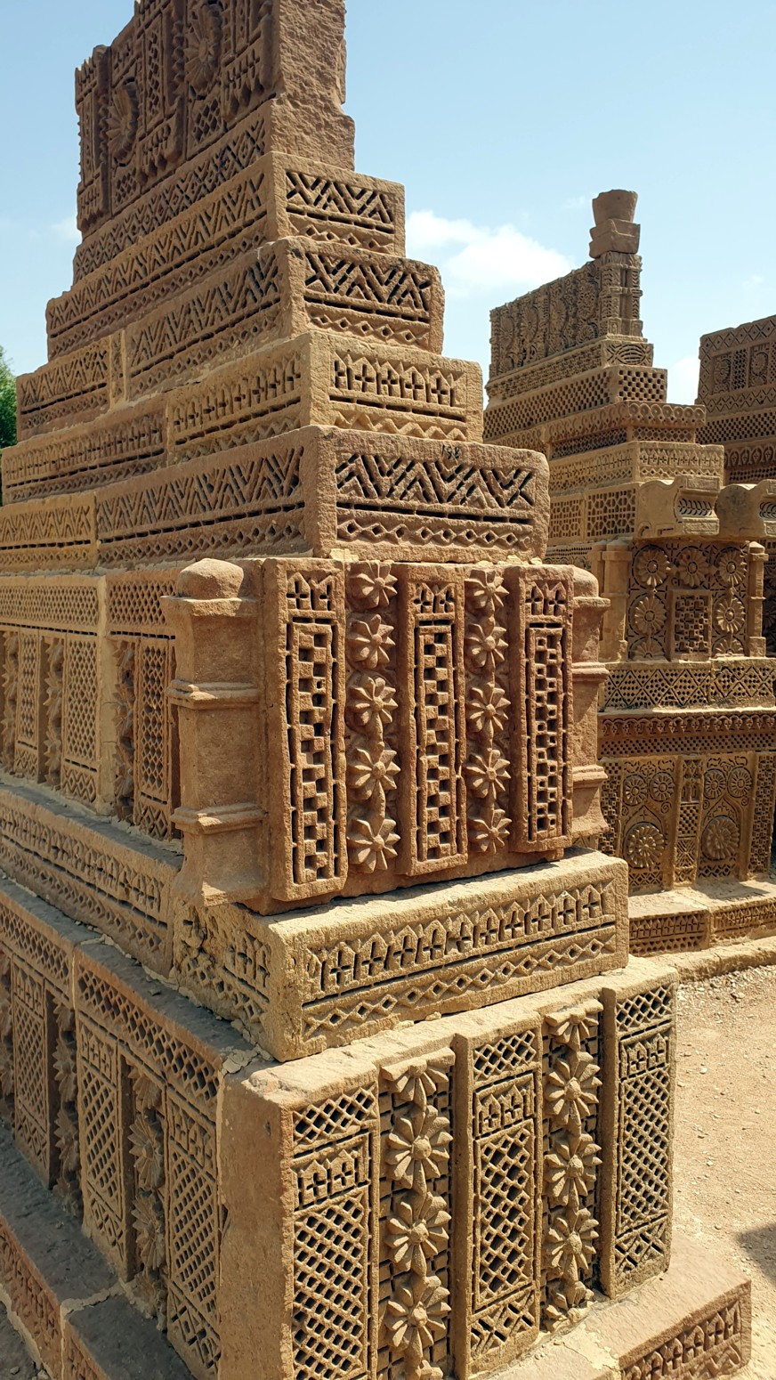 jinetes, escenas de caza, armas y joyas, construidas con el estilo arquitectónico funerario típico del bajo Sindh. La