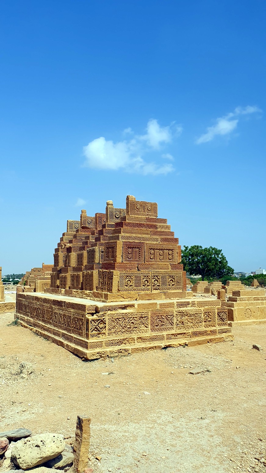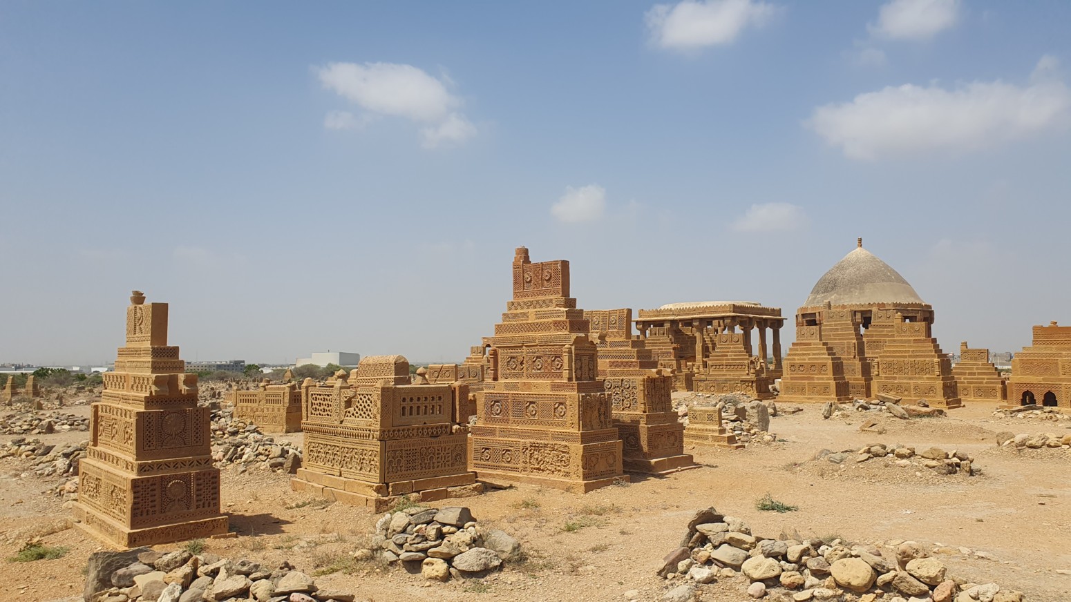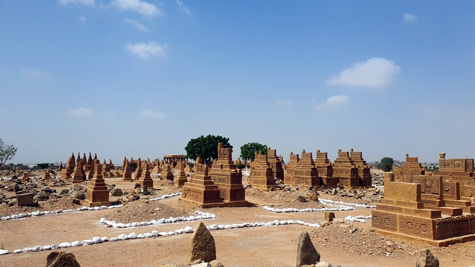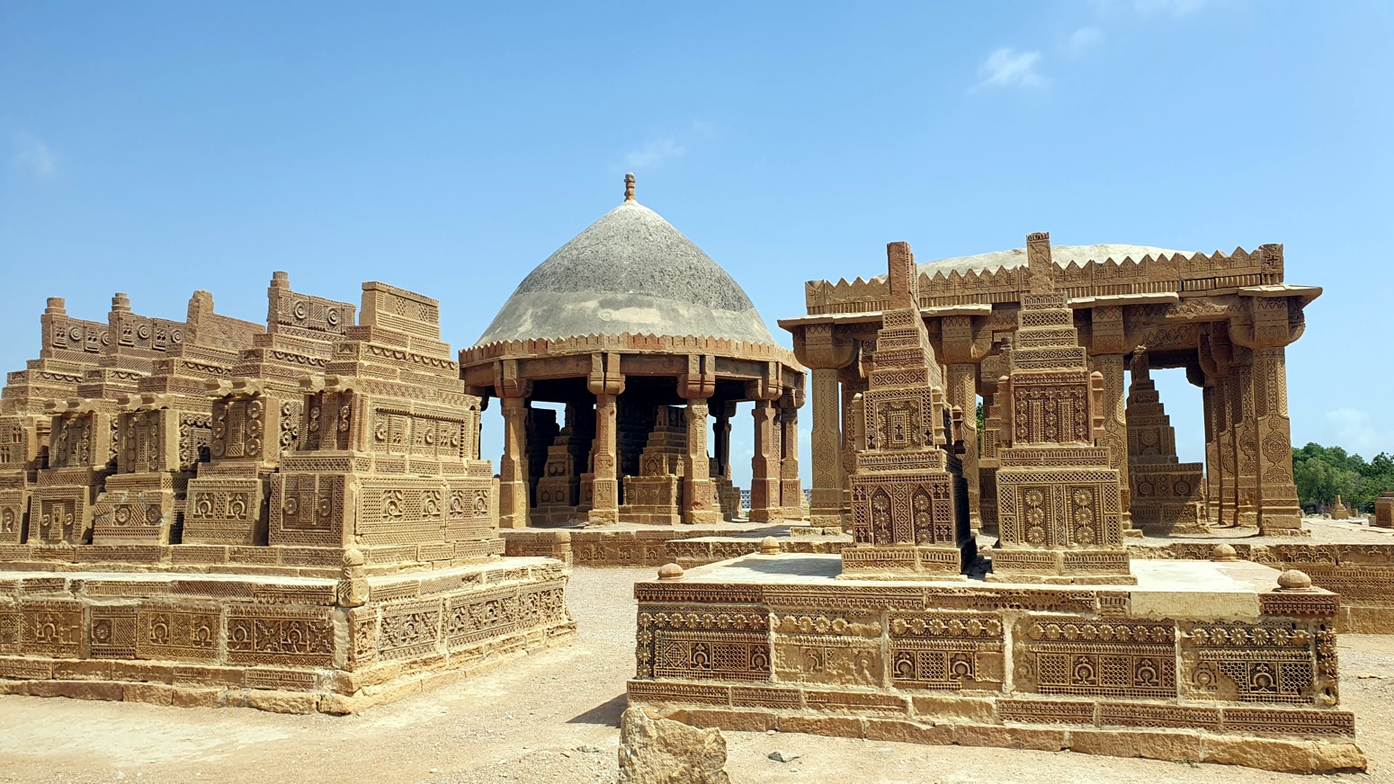 jinetes, escenas de caza, armas y joyas, construidas con el estilo arquitectónico funerario típico del bajo Sindh. La
