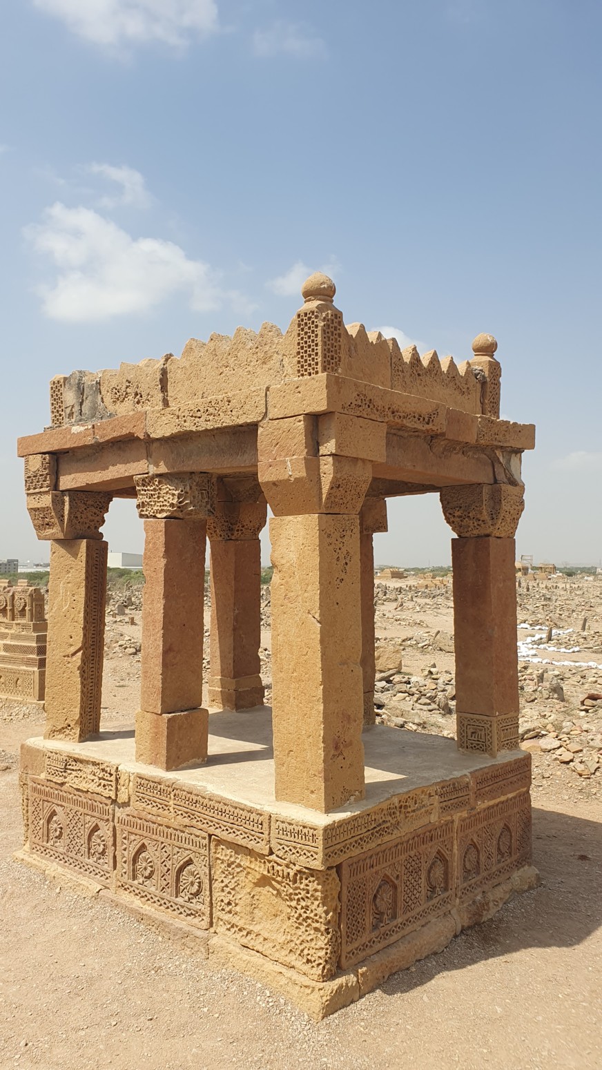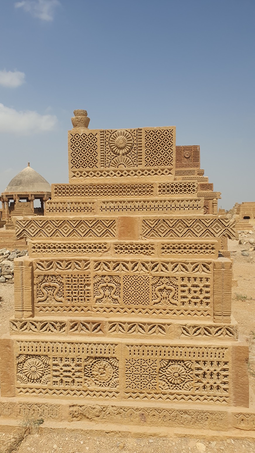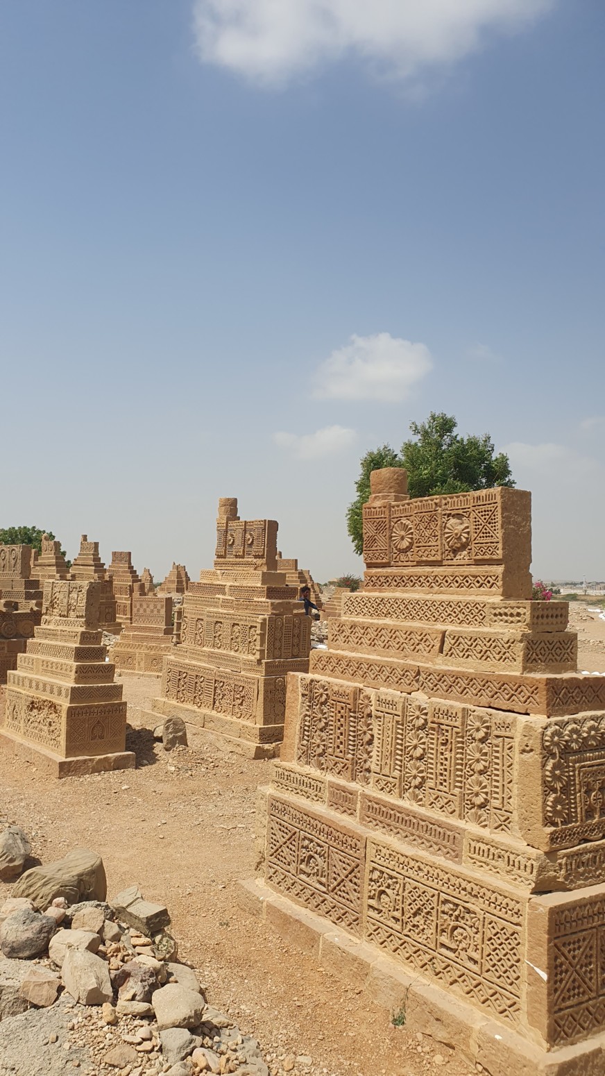llamativo por sus tumbas talladas de piedra arenisca de color beige, construidas sobre plataformas elevadas en forma de