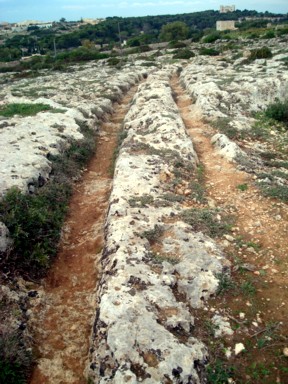 excavados en la roca, que corren paralelos los unos a los otros, como raíles de