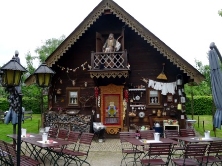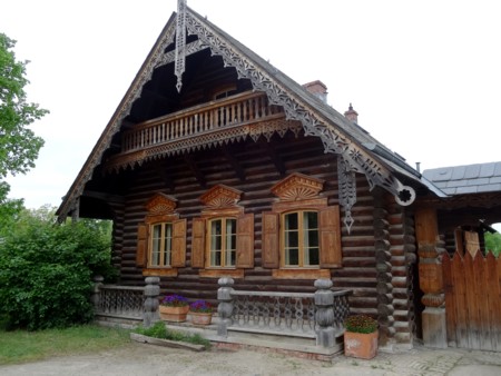 varias casas de madera decoradas con tallas (fotos 1 a 8), jardines y