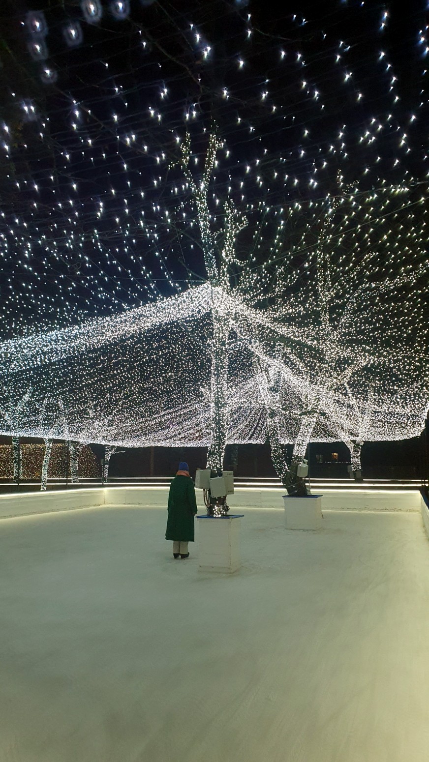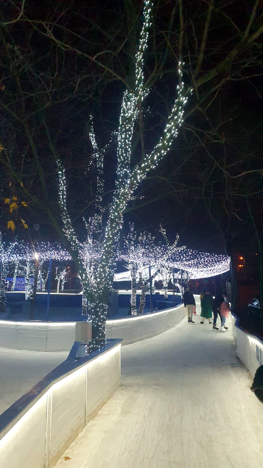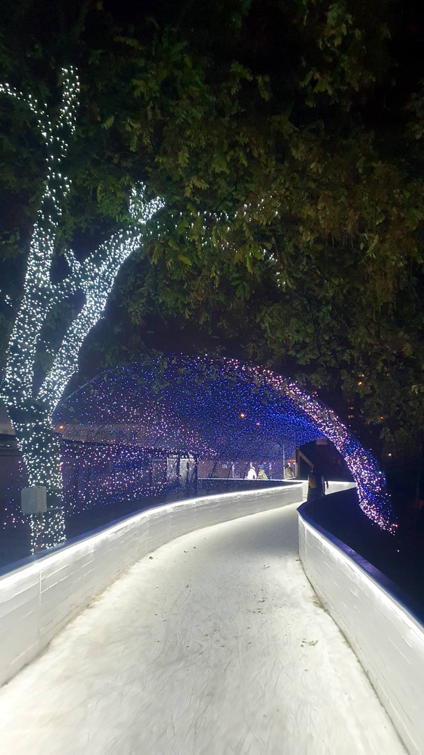 recorrido de hielo entre árboles iluminados que