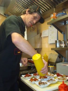 Charlottenburg de Berlín friendo salchichas con una salsa de tomate, polvo de