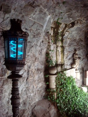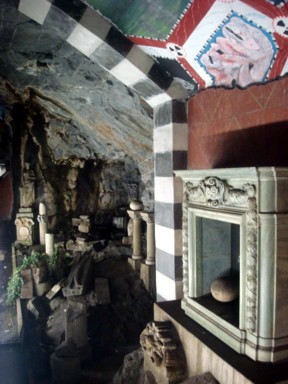 parece una caverna con sus techos pintados de rojo y pinturas rupestres)(fotos