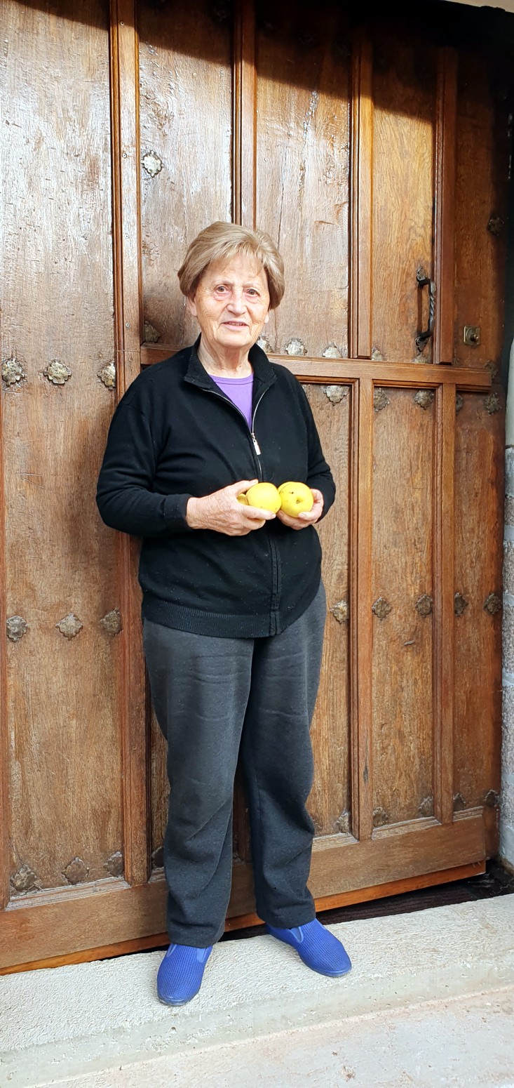 manzanas nos la da ella, y baja hasta su puerta con unas manzanas para regalarnos...le