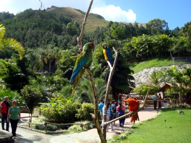 Hay muchos animales sueltos por todos lados, loros, pavos reales, cerdos, de