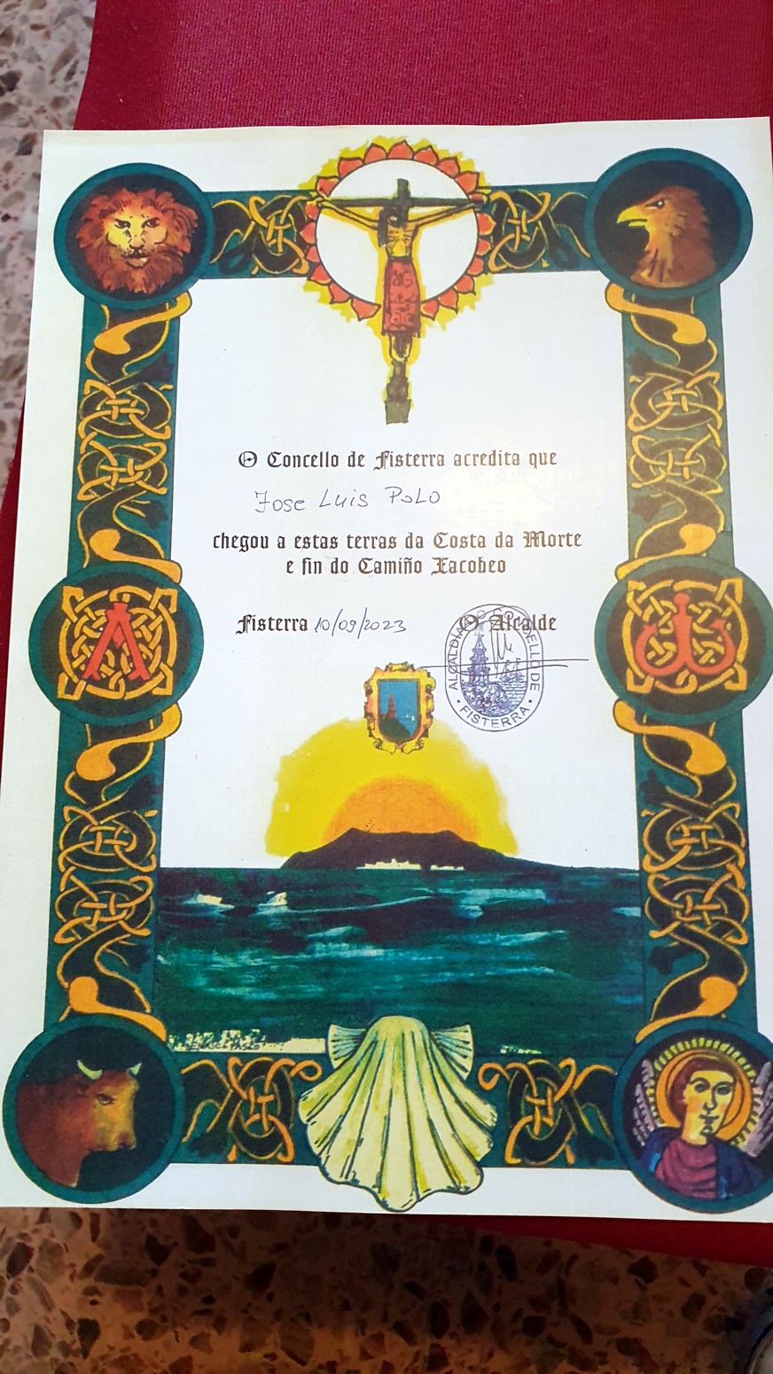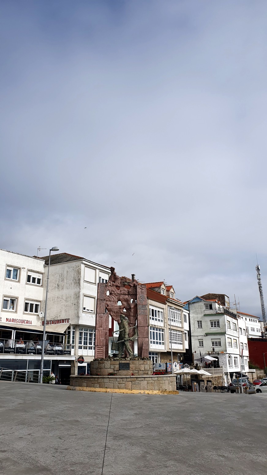 plaza de Ara Solís ya en Fisterra. El crucero muestra a Cristo crucificado y a la Virgen del Socorro. Y ya en la carretera de acceso al Faro se encuentra la iglesia de Santa María