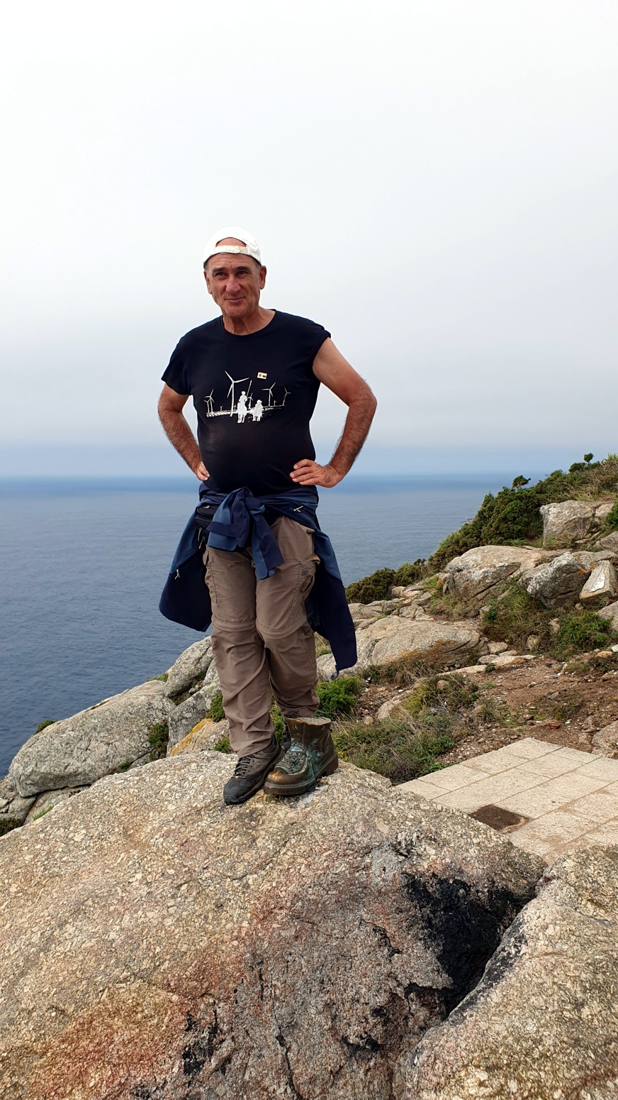 Desde Fisterra hasta el Faro, se va por siguiendo la carretera y a mitad de la subida veremos una moderna escultura de un peregrino medieval. Y ya en el faro, el mojón de los