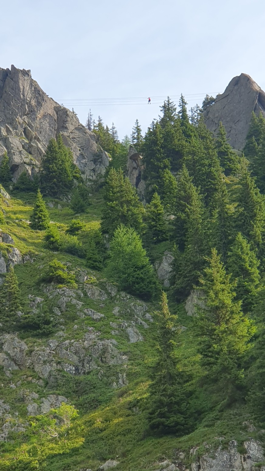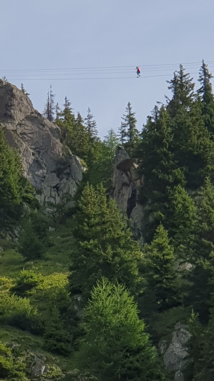 La vía comienza con varios tramos siguiendo el cable, luego sale en un puente de cuerda muy largo. La ruta incluye una ruta de escape en ambos