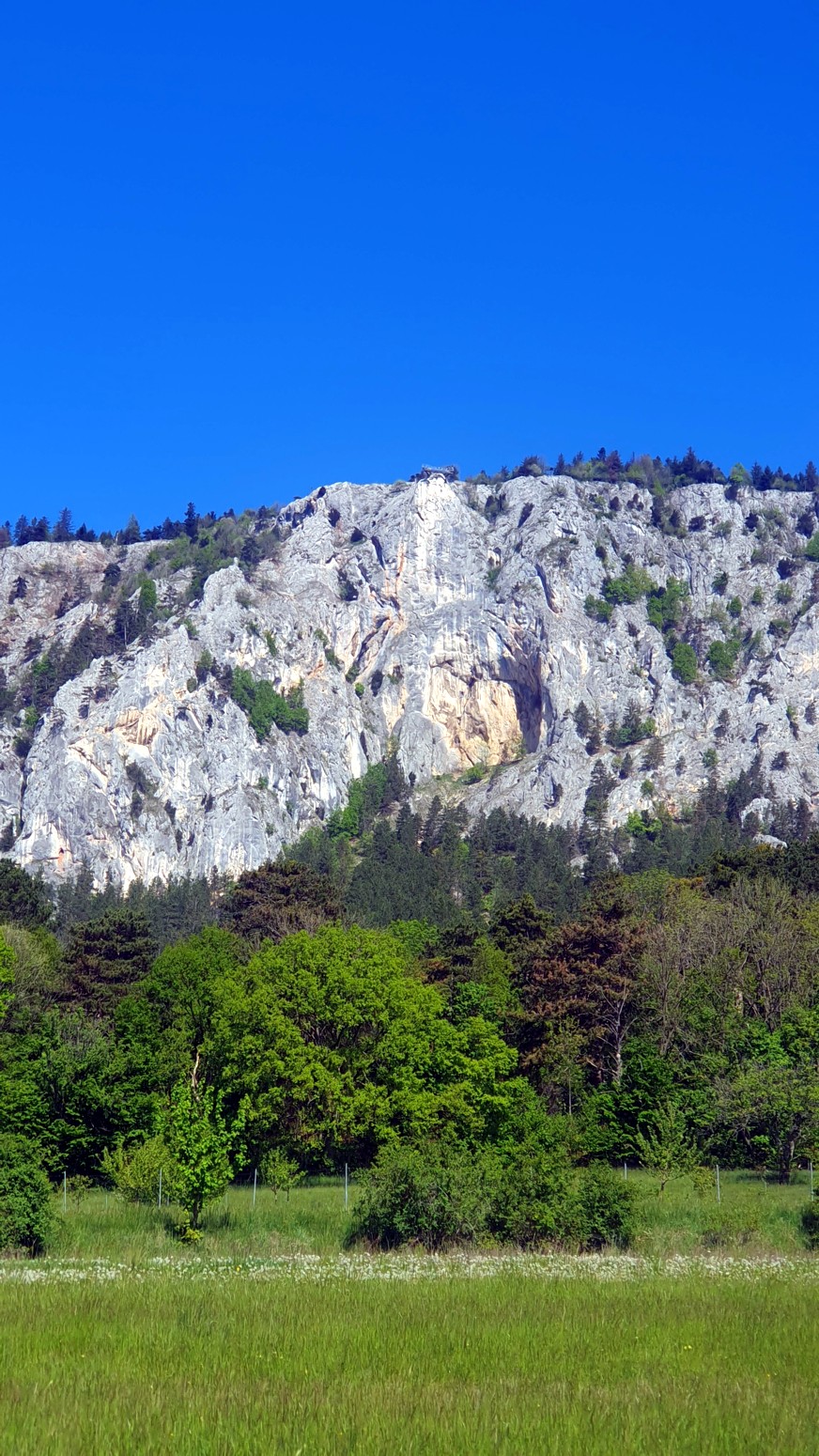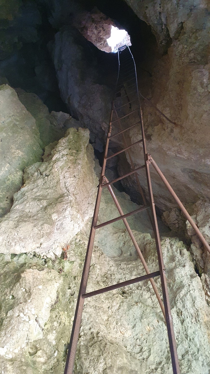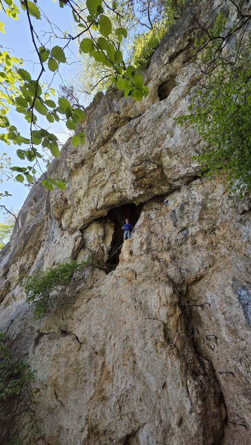 conduce a lo largo de la cornisa rocosa y pasa a una cueva de roca, donde hay una chimenea de unos 15 metros de altura