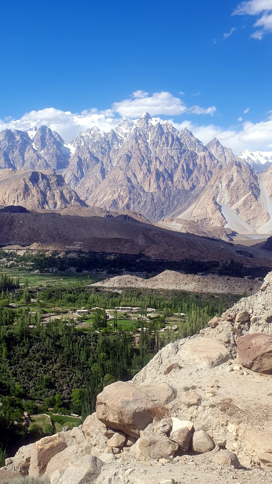 se puede ver el lago Attabad, los conos de Passu, el pico Shisper y la torre Gulmit.