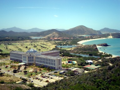 lejos se aprecia su playa y su entorno rodeado del único campo de golf de 18