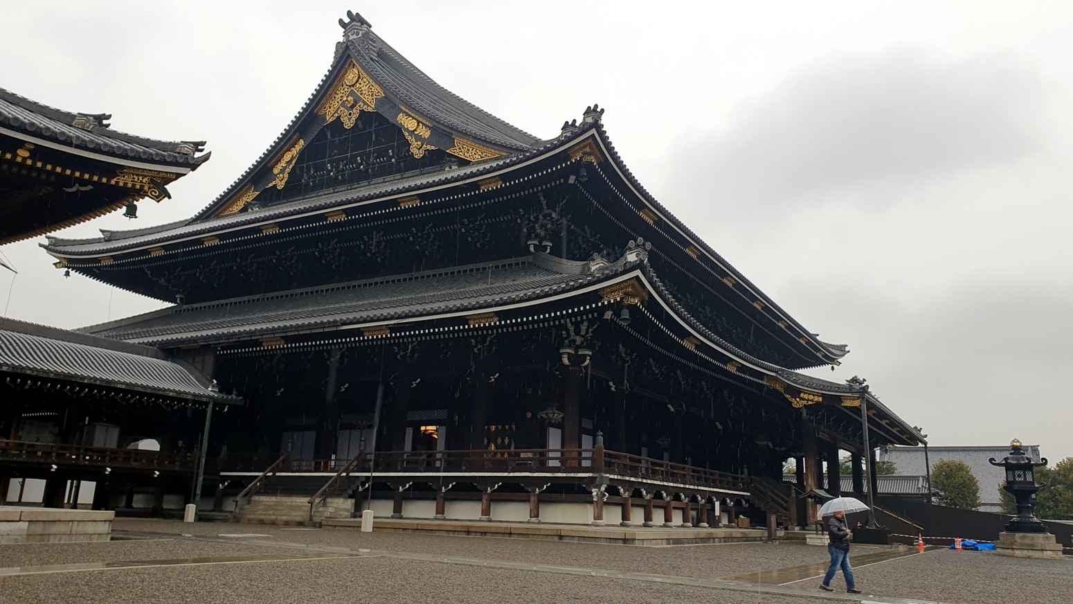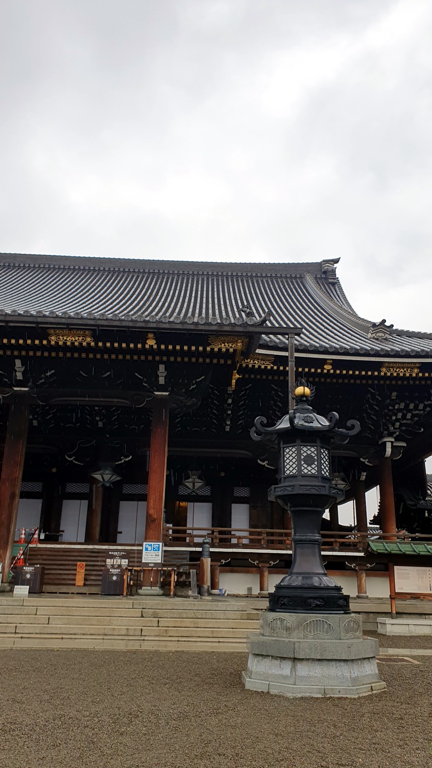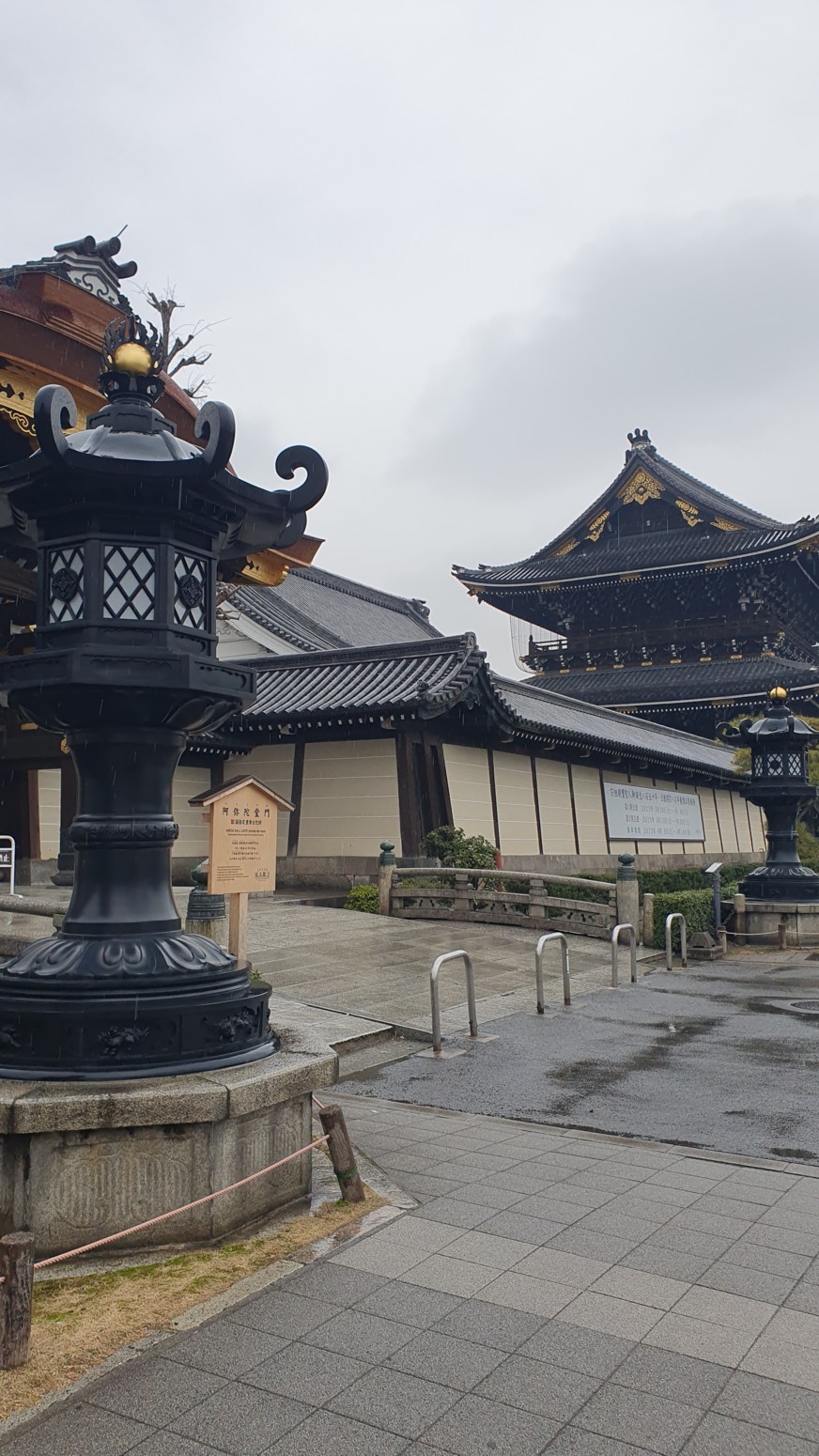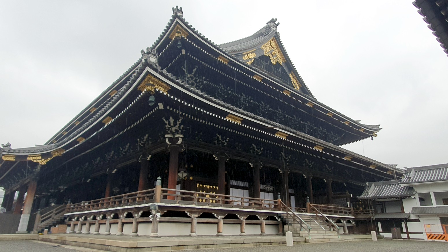 Es el templo Higashi Honganji, uno de los grandes centros populares del budismo en Kioto, y la entrada es completamente gratuita.