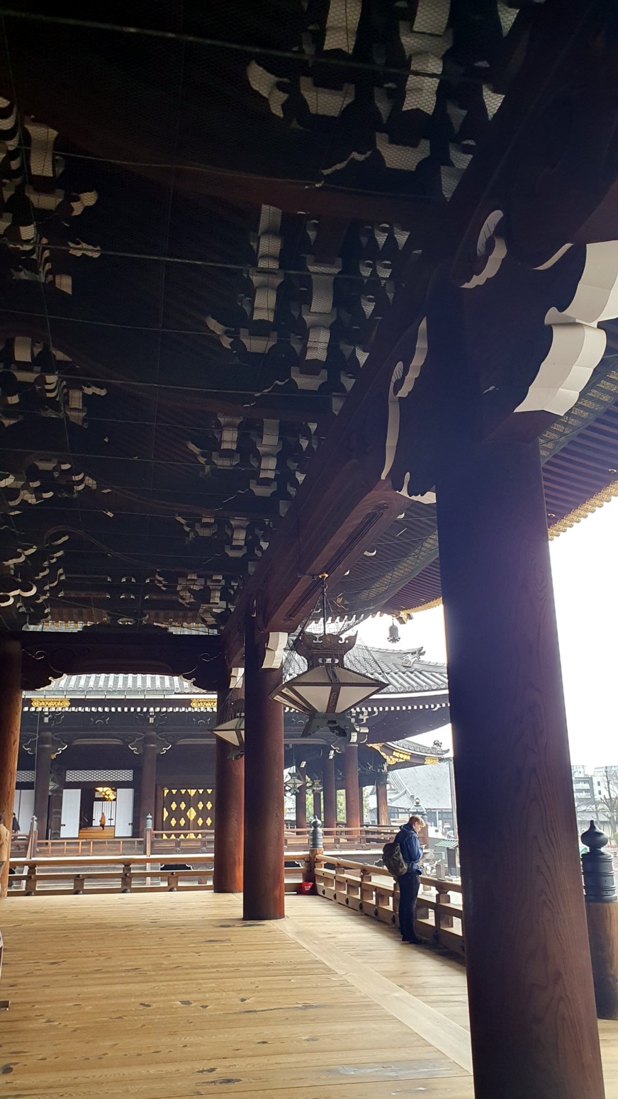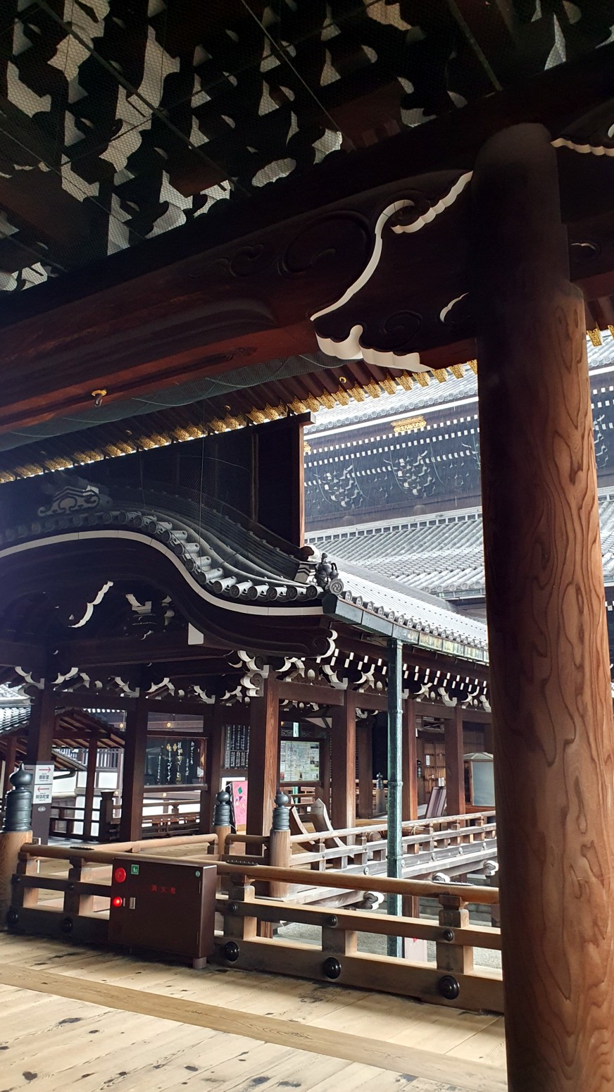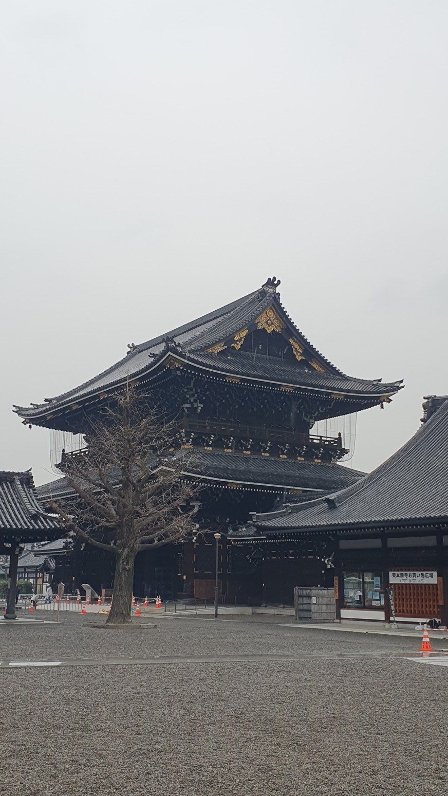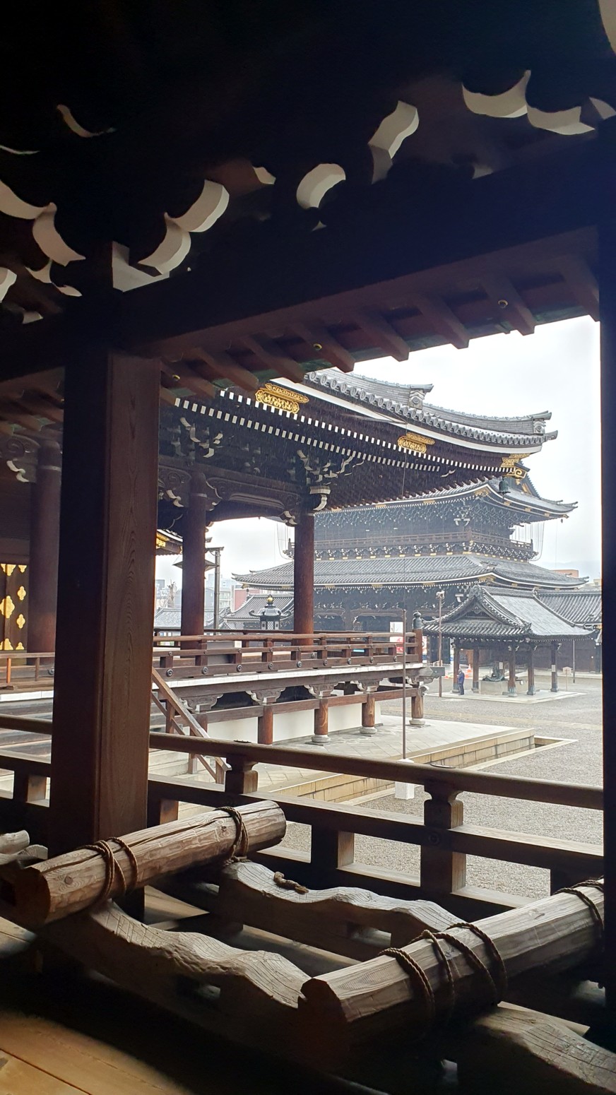 Es el templo Higashi Honganji, uno de los grandes centros populares del budismo en Kioto, y la entrada es completamente gratuita.