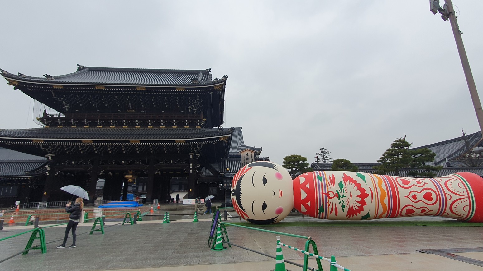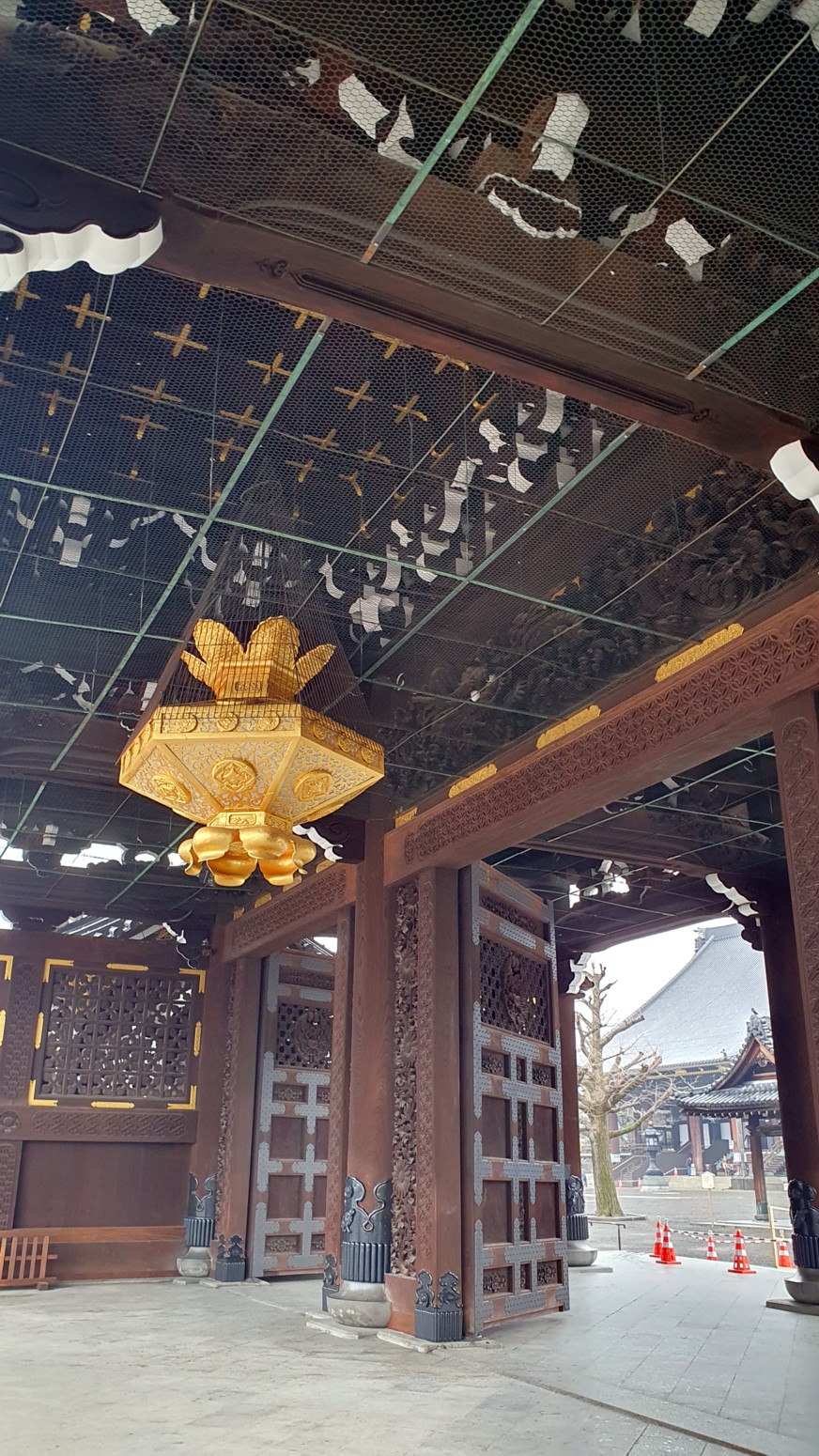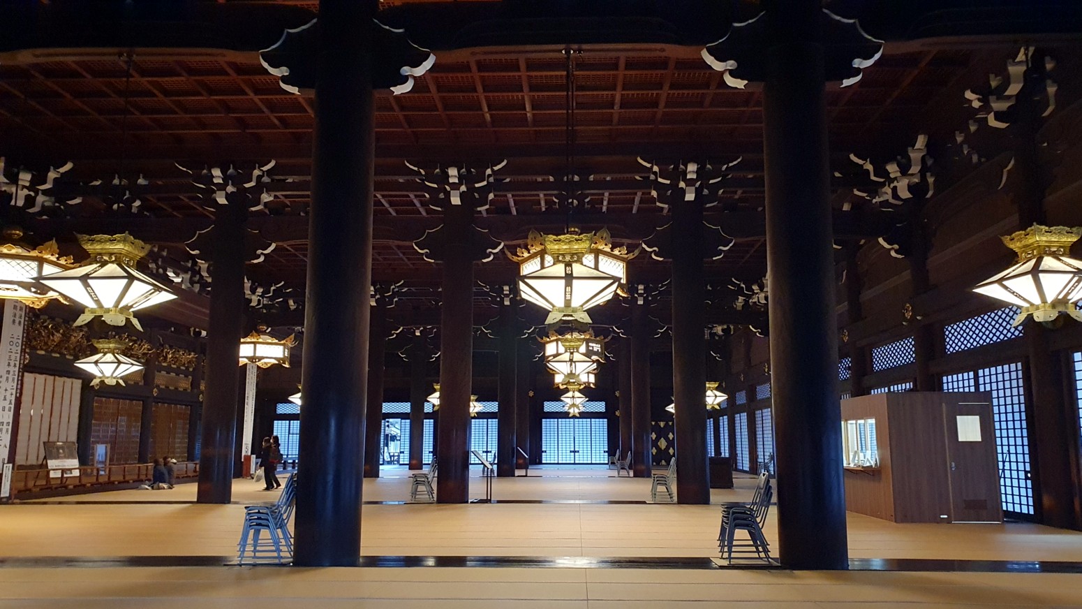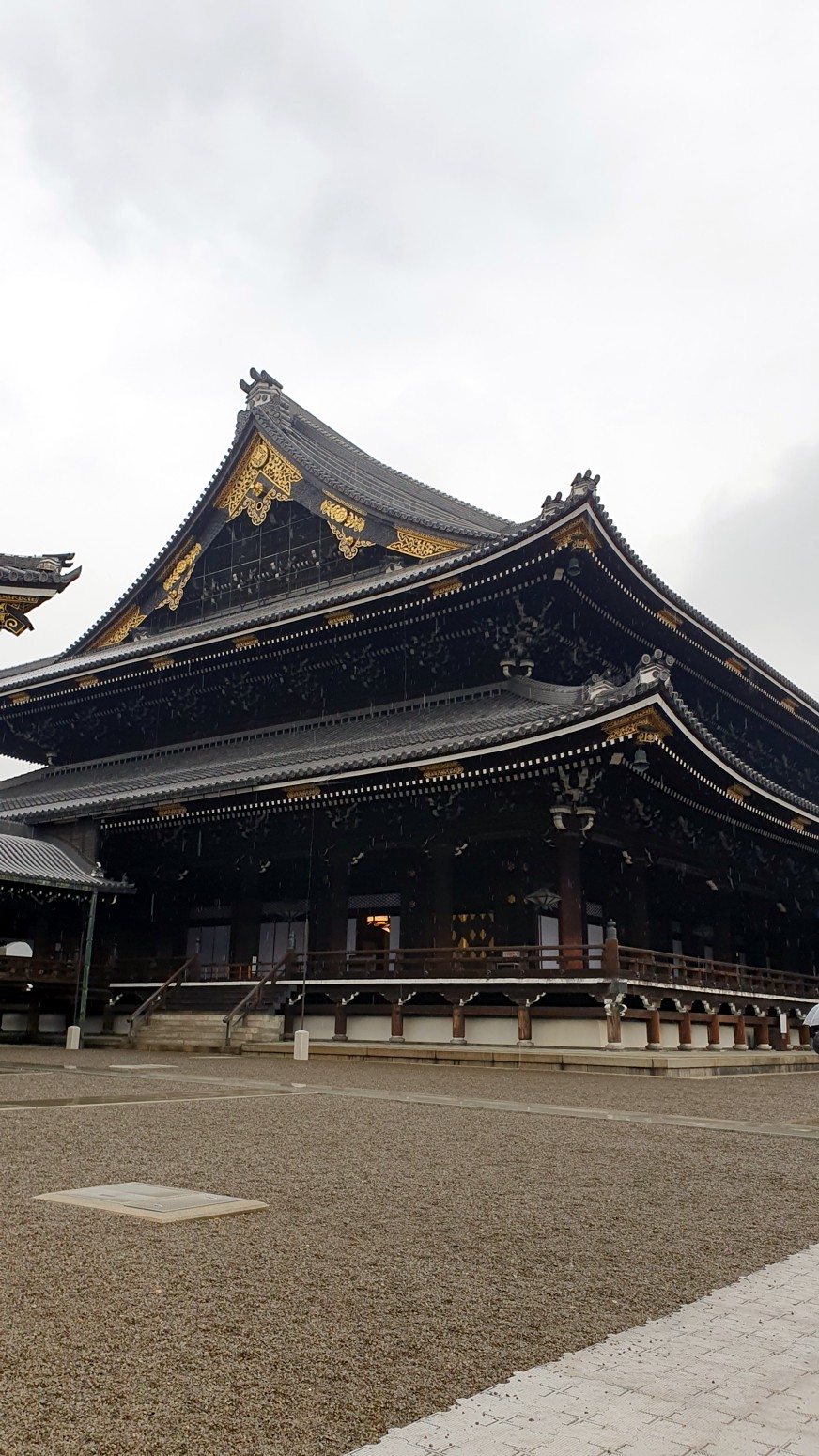 Es el templo Higashi Honganji, uno de los grandes centros populares del budismo en Kioto, y la entrada es completamente gratuita.
