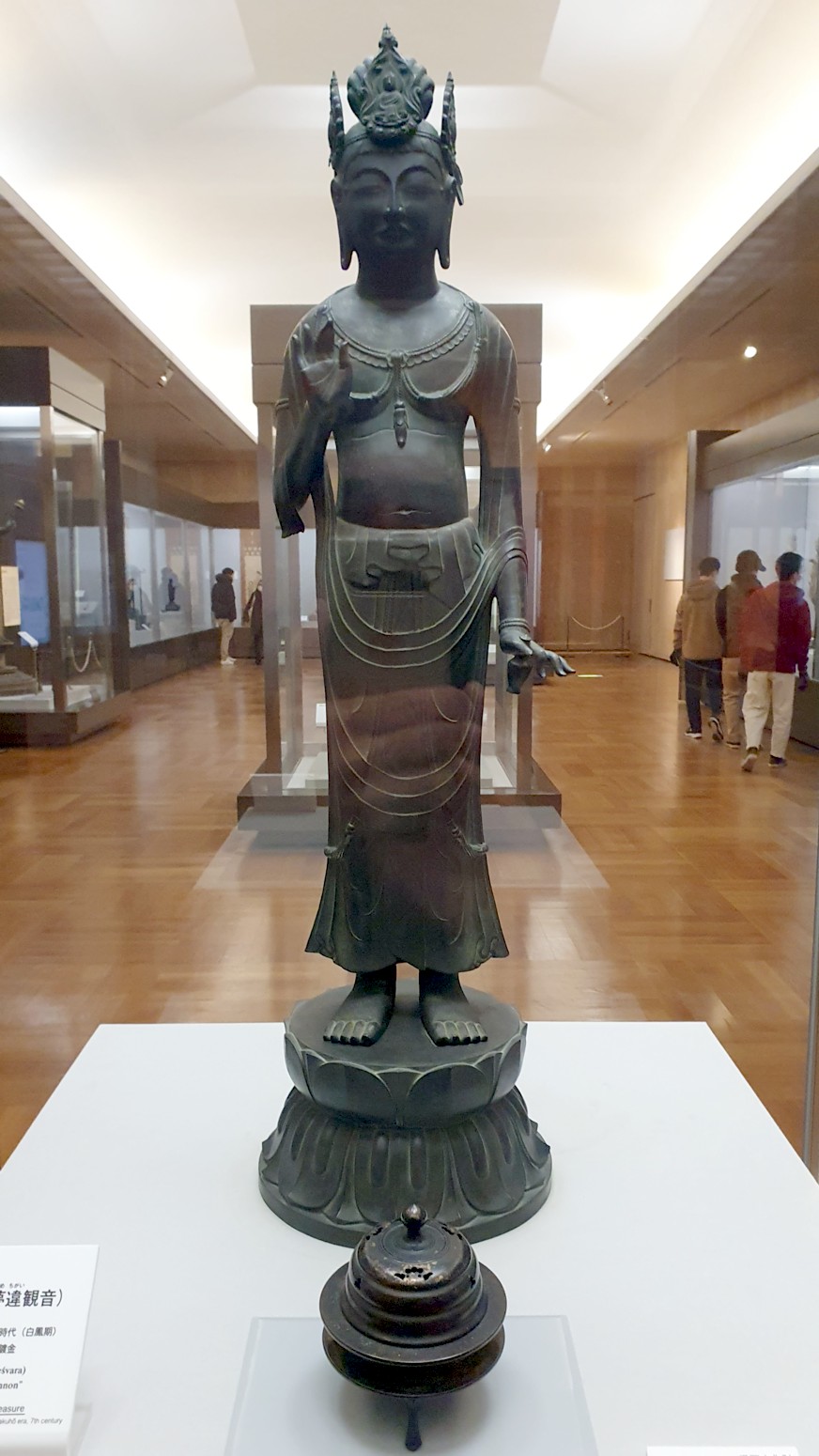 Siddhartha Gautama, acompañado por dos bodhisattvas (seres de Iluminación y compasión pura), hechos de bronce por el capitán Tori en 623 y dedicados al príncipe Shotoku.