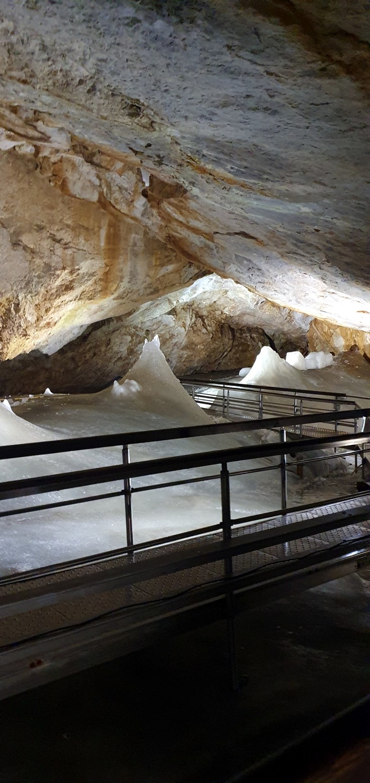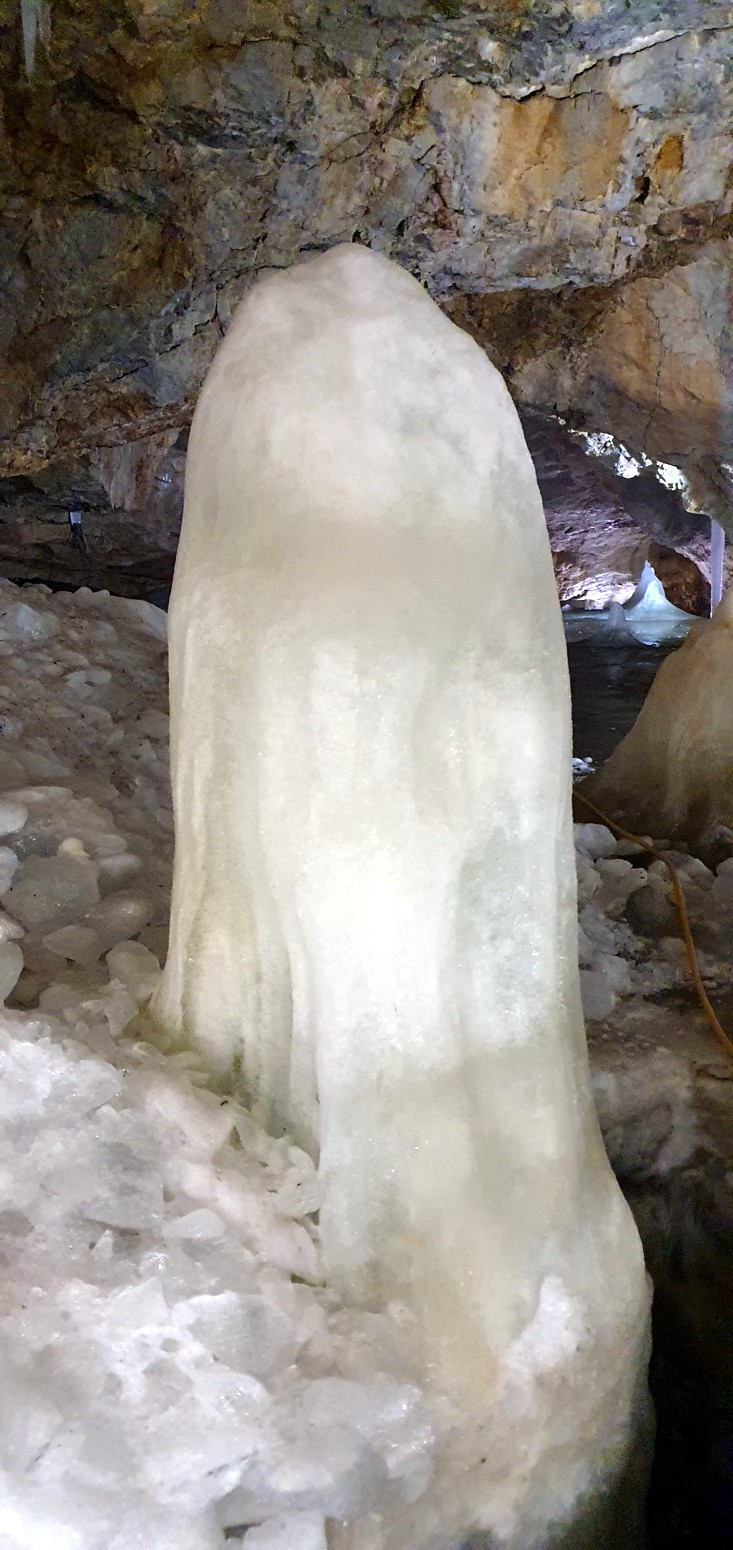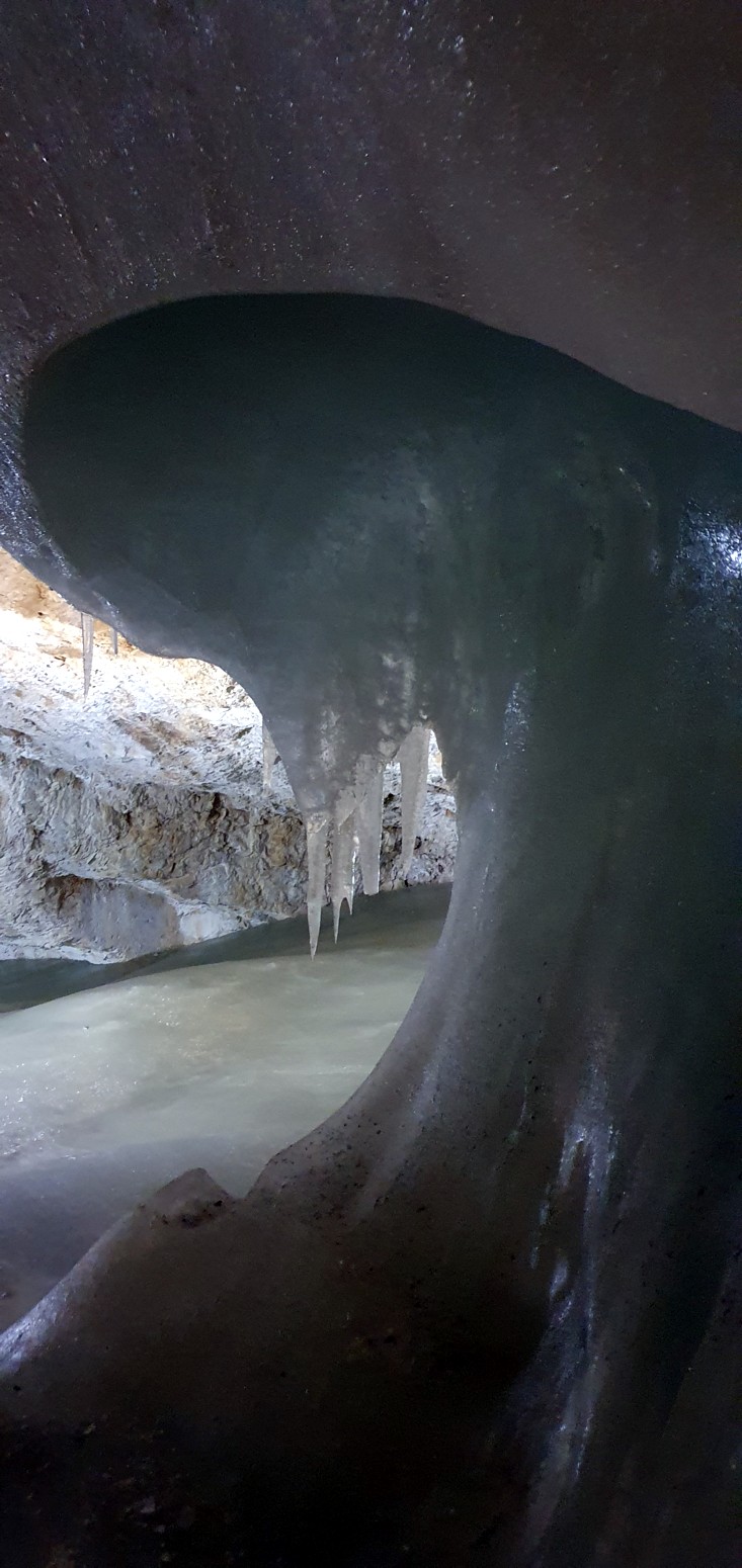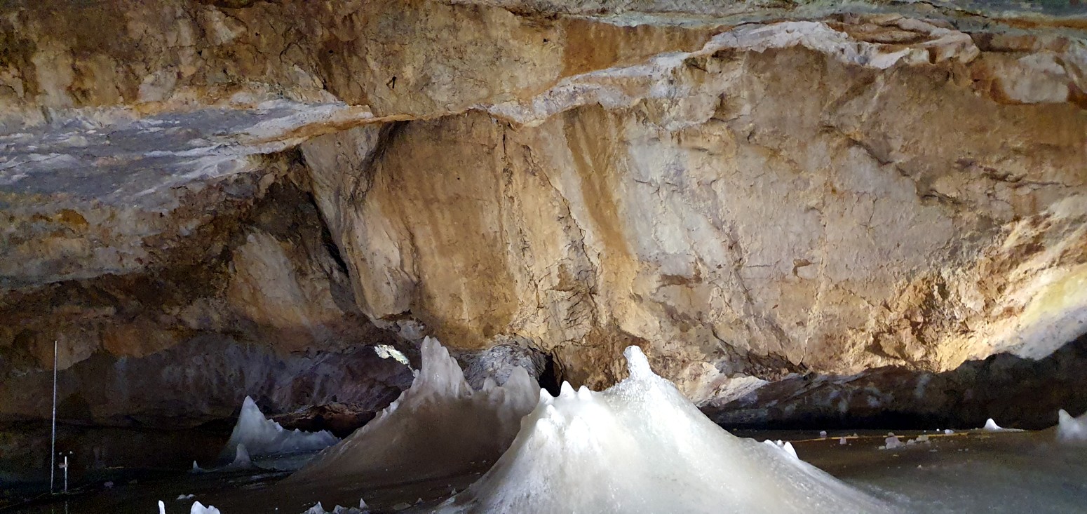 algunas partes como en la gran sala un espesor de 26,5 metros que forman multitud de lagos helados, cascadas, estalactitas y estalagmitas